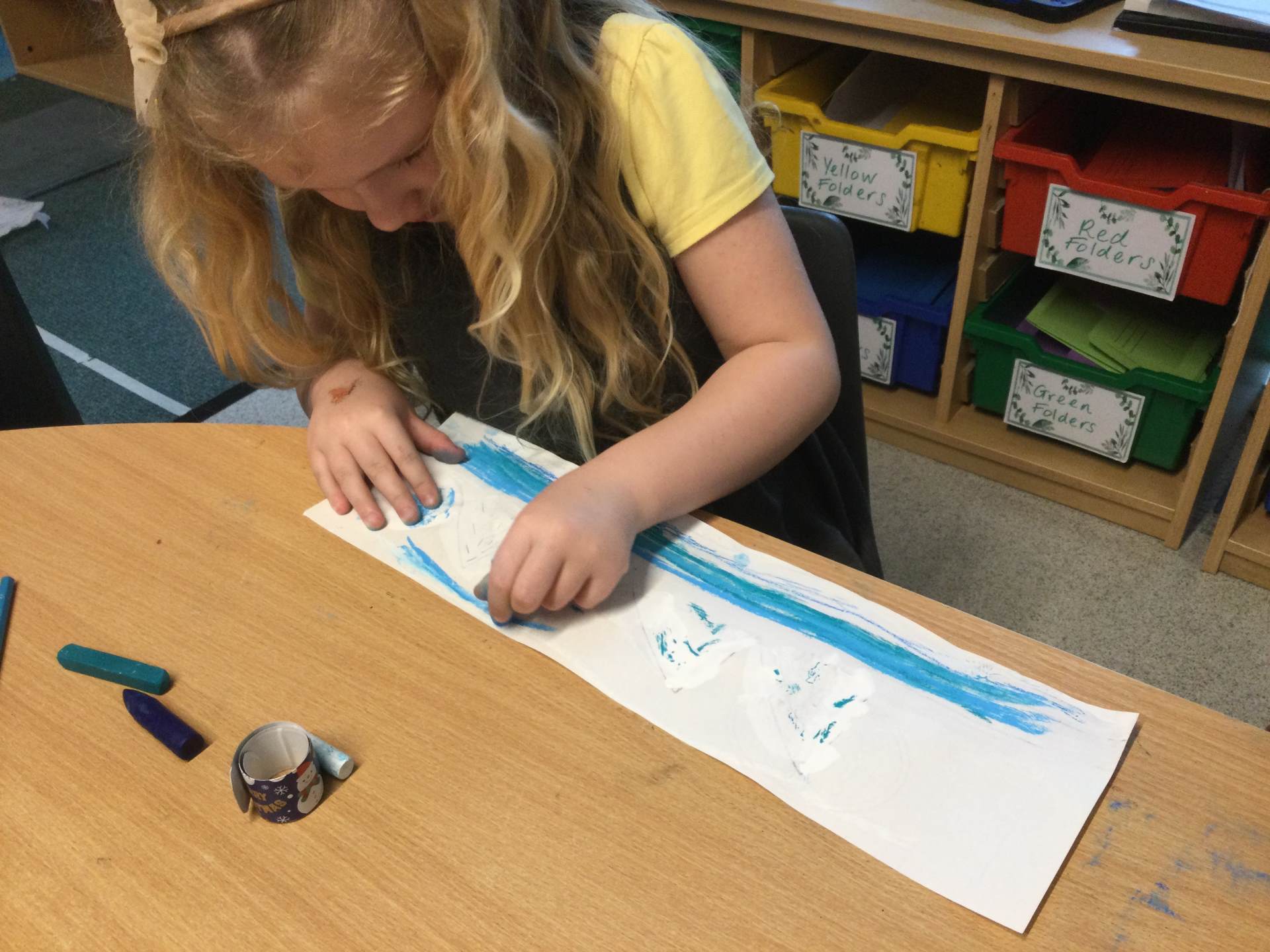 In art, we’ve been learning all about cold colours, like blue, green, and purple. These colours remind us of chilly things, like ice and snow. We used these cold colours to make marks and patterns on different textured papers, exploring how the textures, like smooth, rough, or bumpy, can change the way our art looks. It was so exciting to experiment with colours and textures, just like real artists!