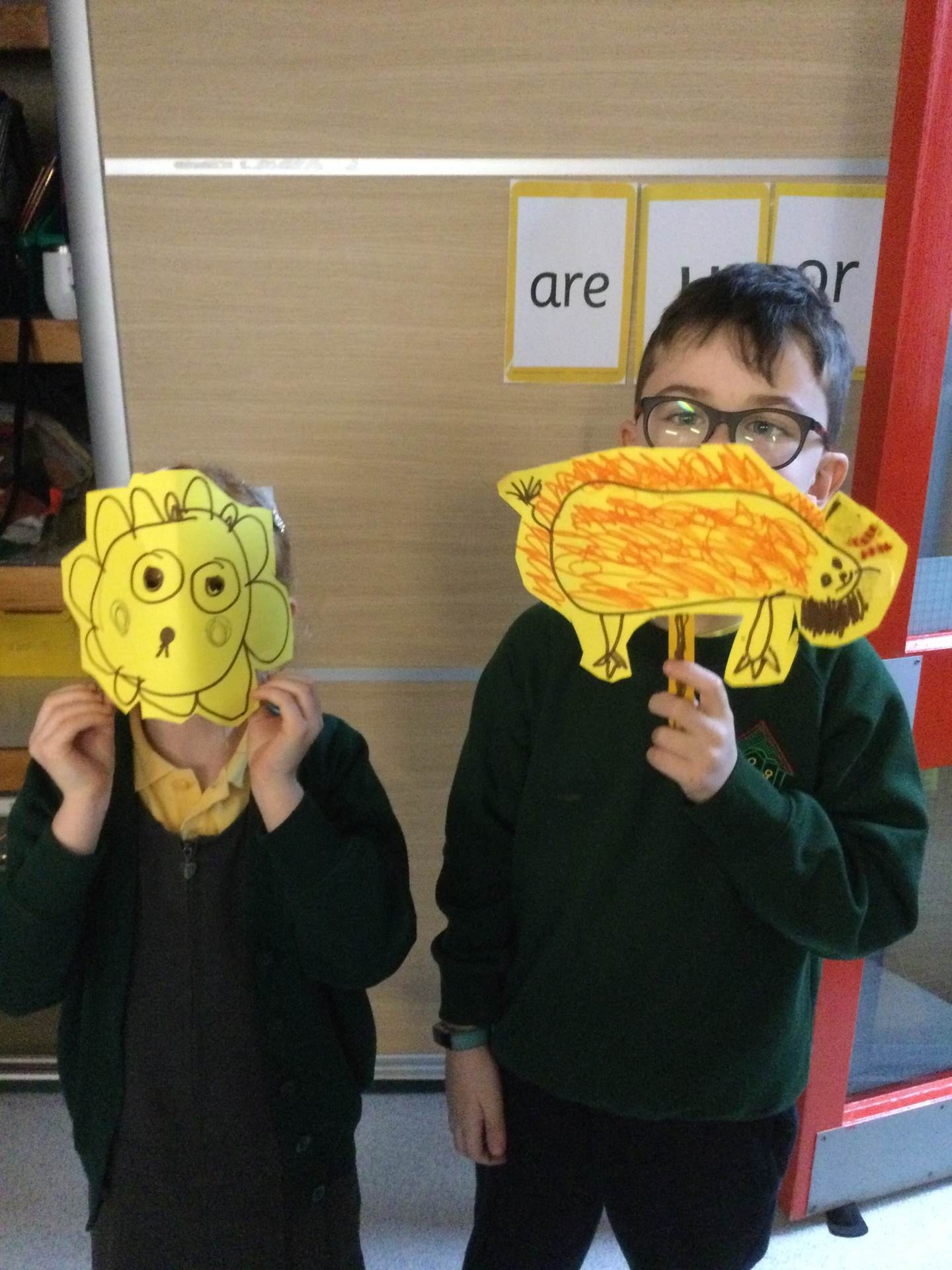 In maths, we explored shapes. We looked at how different shapes can fit together to make patterns. Then, we used those shapes to create our own animal pictures! It was so much fun seeing how triangles, circles, and squares can make something completely new.
