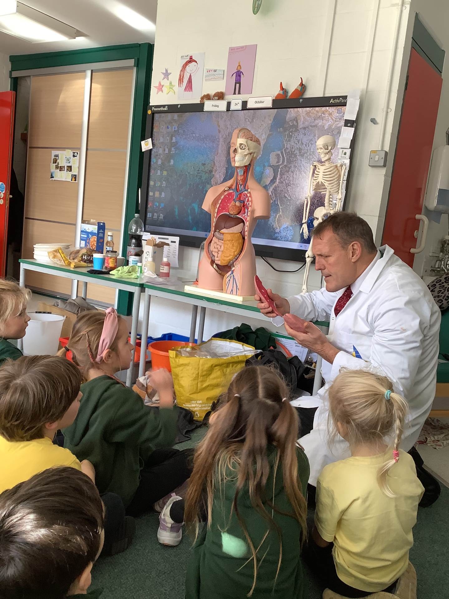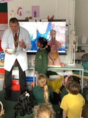 In Science we have been learning about how exercise, healthy eating and sleep are good for our bodies. We completed 5 different exercise activities such as running, jumping, skipping or hopping for 2 minutes. We found out about our pulse and we had to count our pulse rate very carefully to find out which exercise raised our heart rate the most. We then talked about The Eatwell Guide; to find out which foods belong to which group. Dr Geary then joined us for some Science Workshops on Friday. He showed us how our bodies digest food and we helped him demonstrate this using real food!