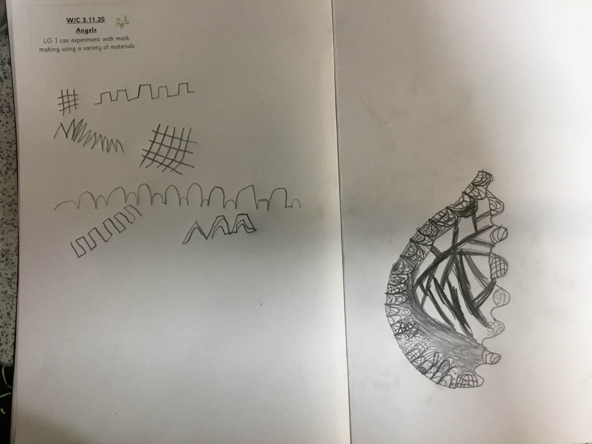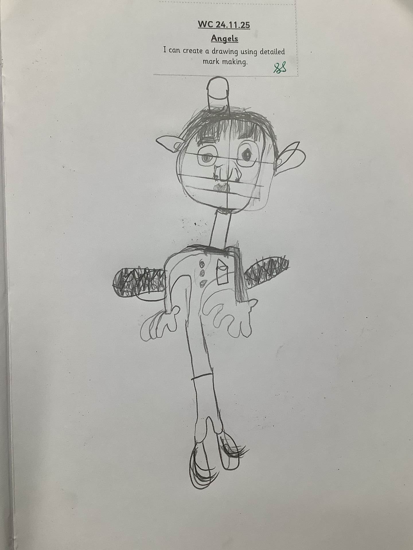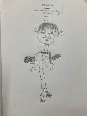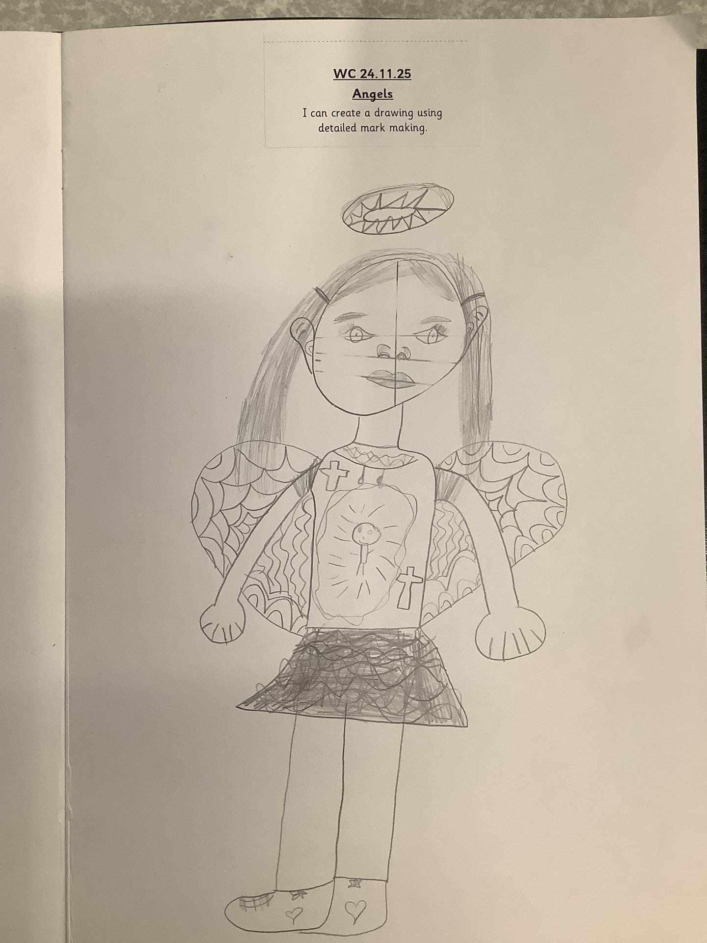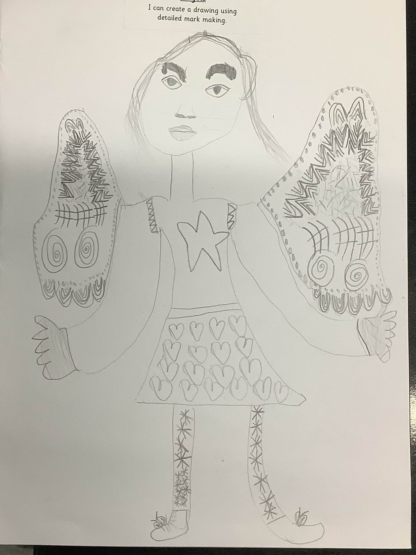 In Art, we moved on from self-portraits to drawing a picture of an Angel in our own image. We used the mark marking skills we had practised to help us draw the wings and then the body and the face resembled us.