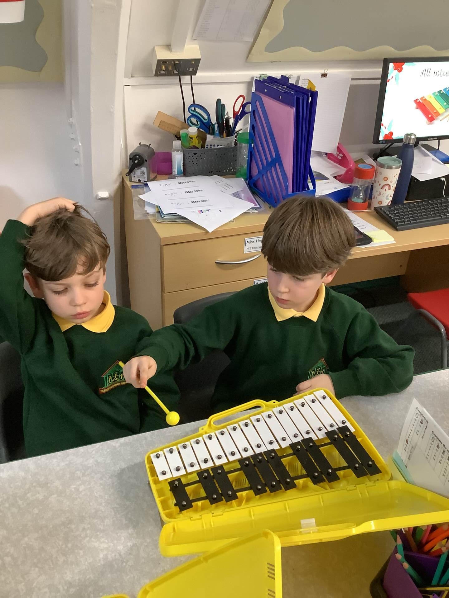 In Music, we had fun playing the glockenspiels. We discovered that the longer bars on the left make the lower notes and explored different ways to play, such as climbing up and down the notes, sliding between them, and even jumping over some!