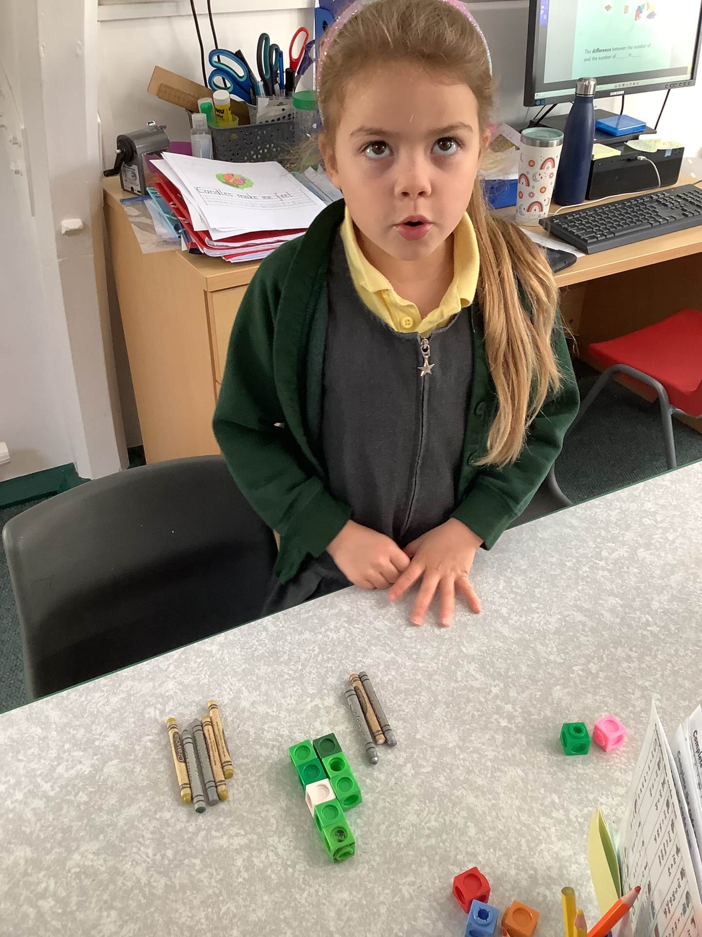 In Maths, we have been learning about subtraction as difference and solving problems such as, “A teacher has 8 children and 2 pencils. How many more pencils will she need?” We have used resources including multilink and Cuisenaire rods to support our learning.