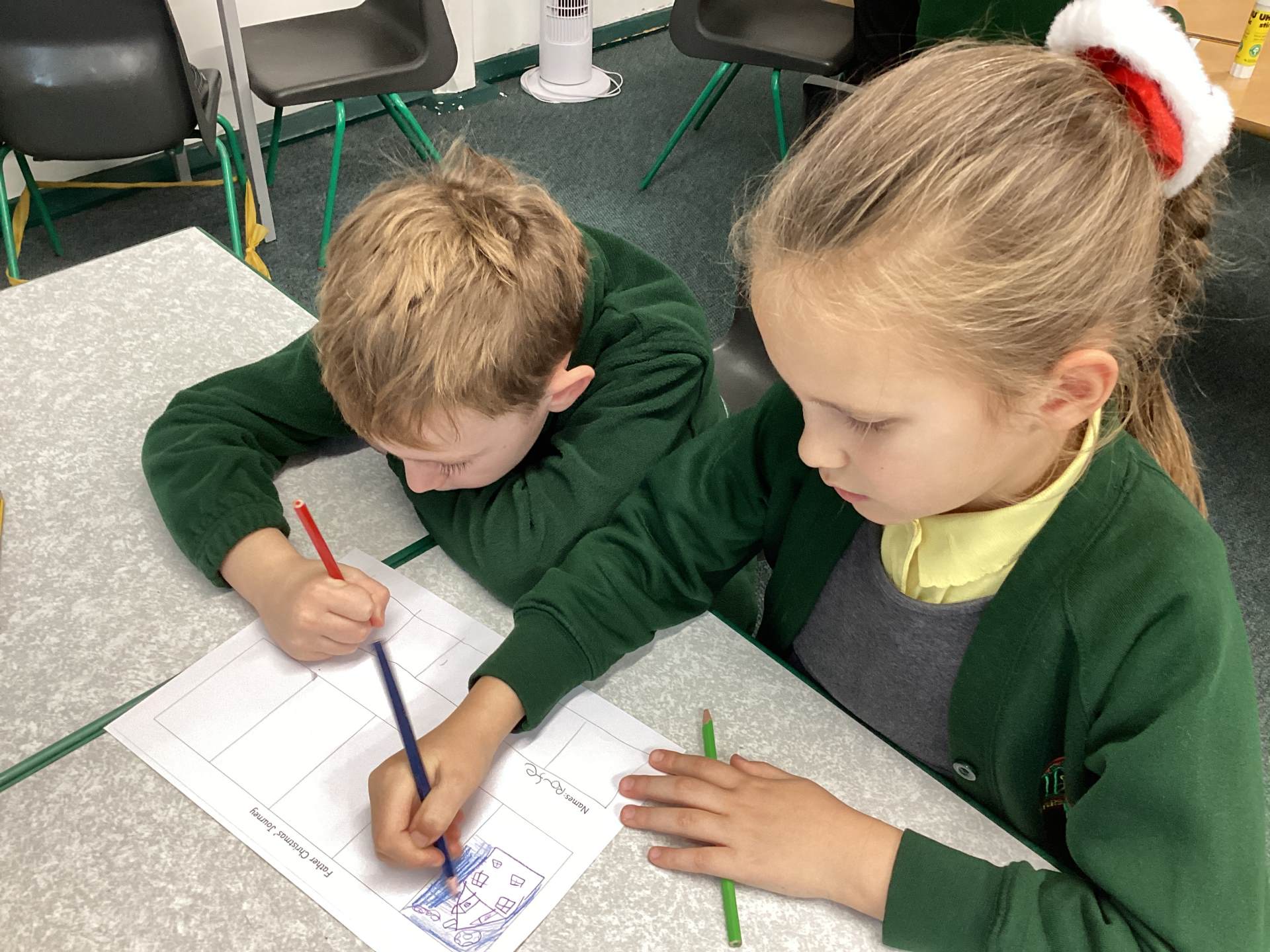 We thoroughly enjoyed Christmas Jumper Day and Art Day! In art, we revisited the paintings of Fra Angelico, particularly his colourful angel wings. We experimented with various materials to create 3D angel decorations, focusing on making them look like ourselves. When we bring them home, be sure to ask us why our angels look the way they do and how they represent us!