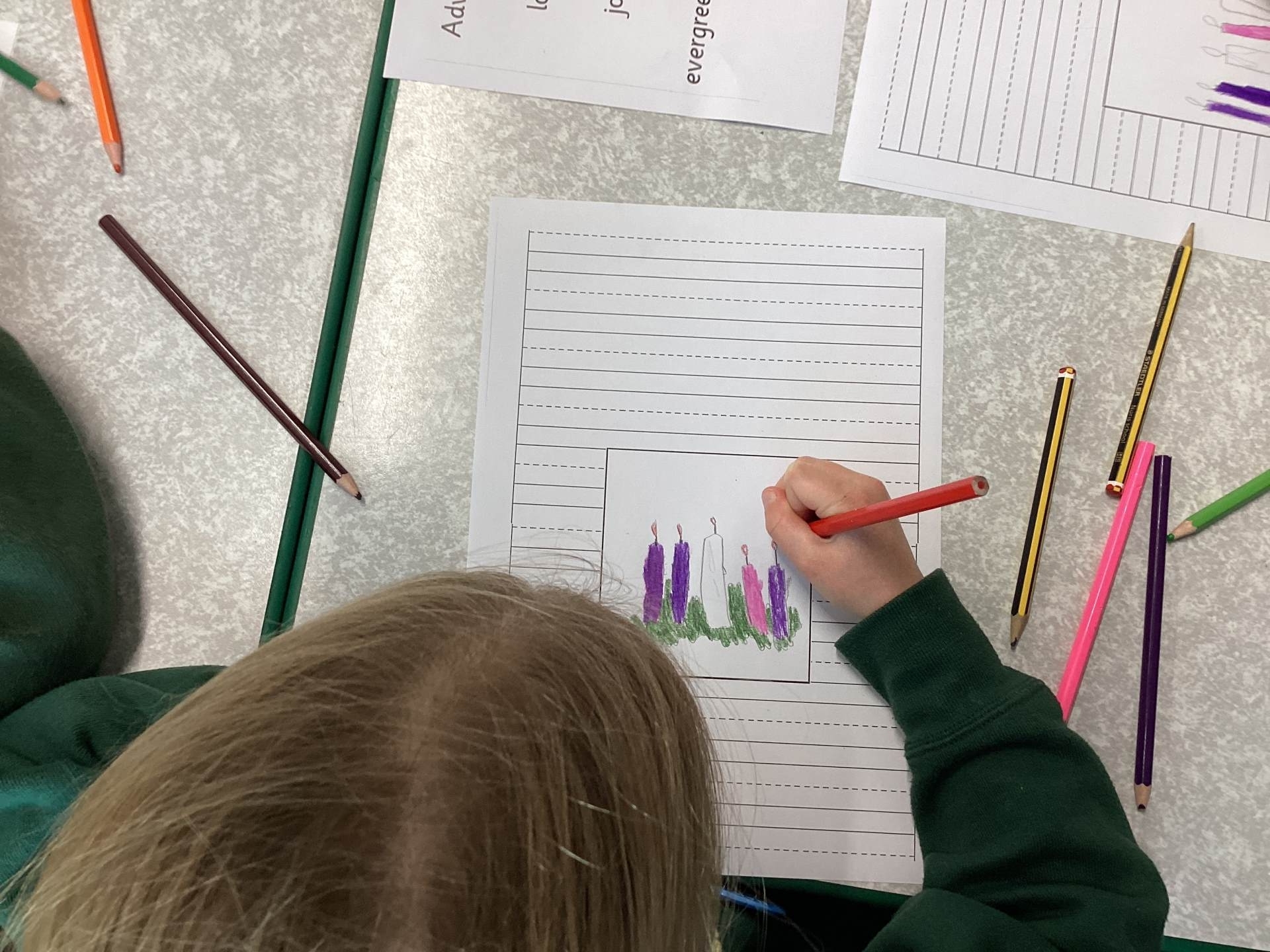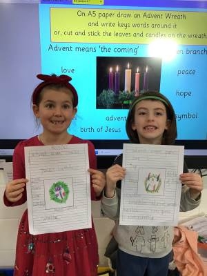 In RE we have been learning about Advent, which means ‘coming’ and is a Christian celebration to prepare for the Christmas of Jesus’ birth. Whilst some of us have an Advent calendar to countdown to Christmas, the church has its own rituals using candles. we looked at an Advent wreath and discussed what each part of it means. The round garland is a symbol for God. It has 5 candles on it- one for each of the four Sundays leading up to Christmas and one for Christmas Day itself. There are three purple candles on an Advent Wreath, which represent hope, peace and love. One pink which represents joy and a white one for Christmas Day which symbolises Jesus being the Light of the World.