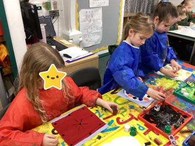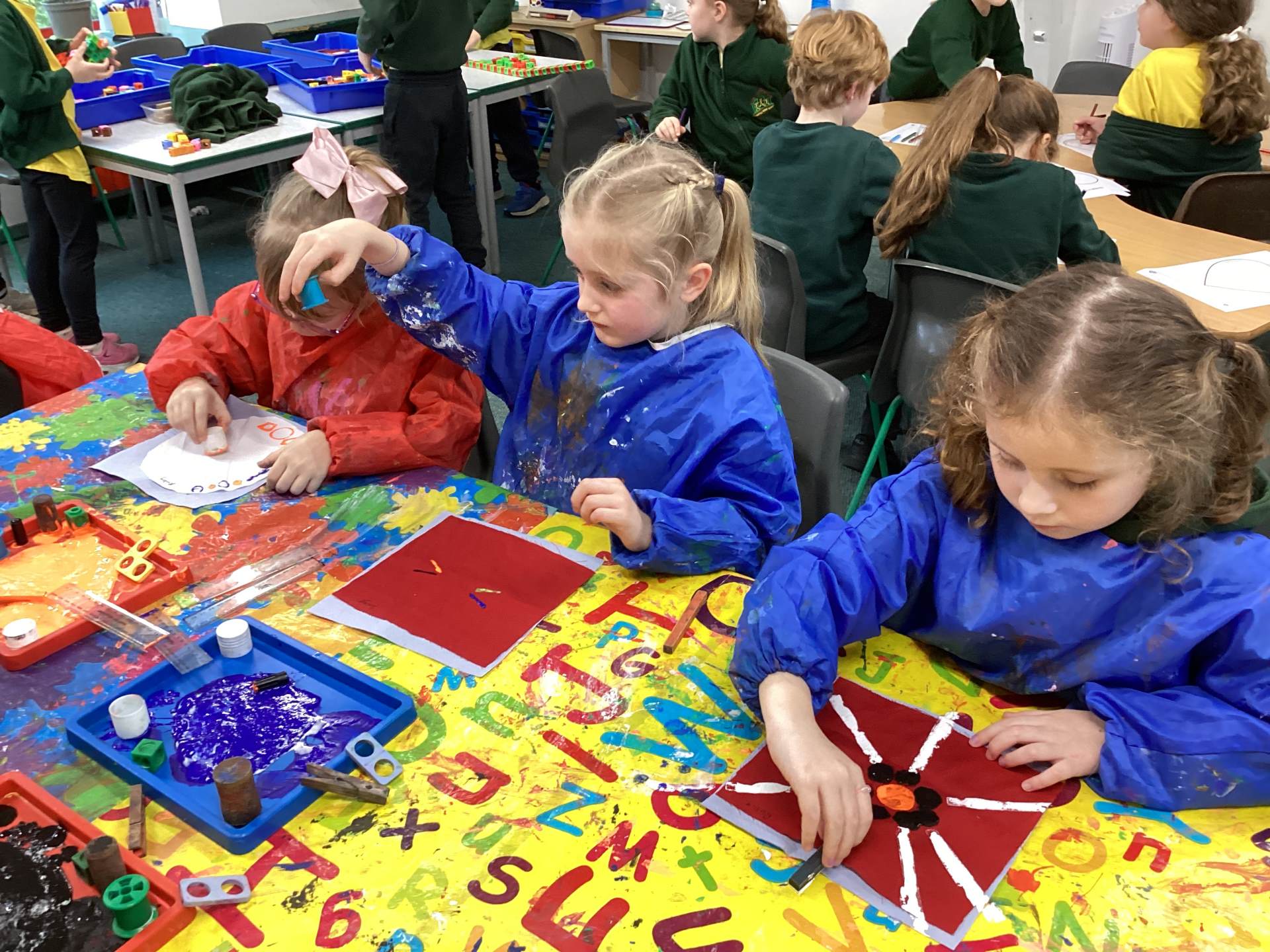 In Art this week we have been learning to press print. We used paint and objects to create repeating patterns on our paper. It was a lot of fun!