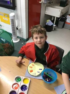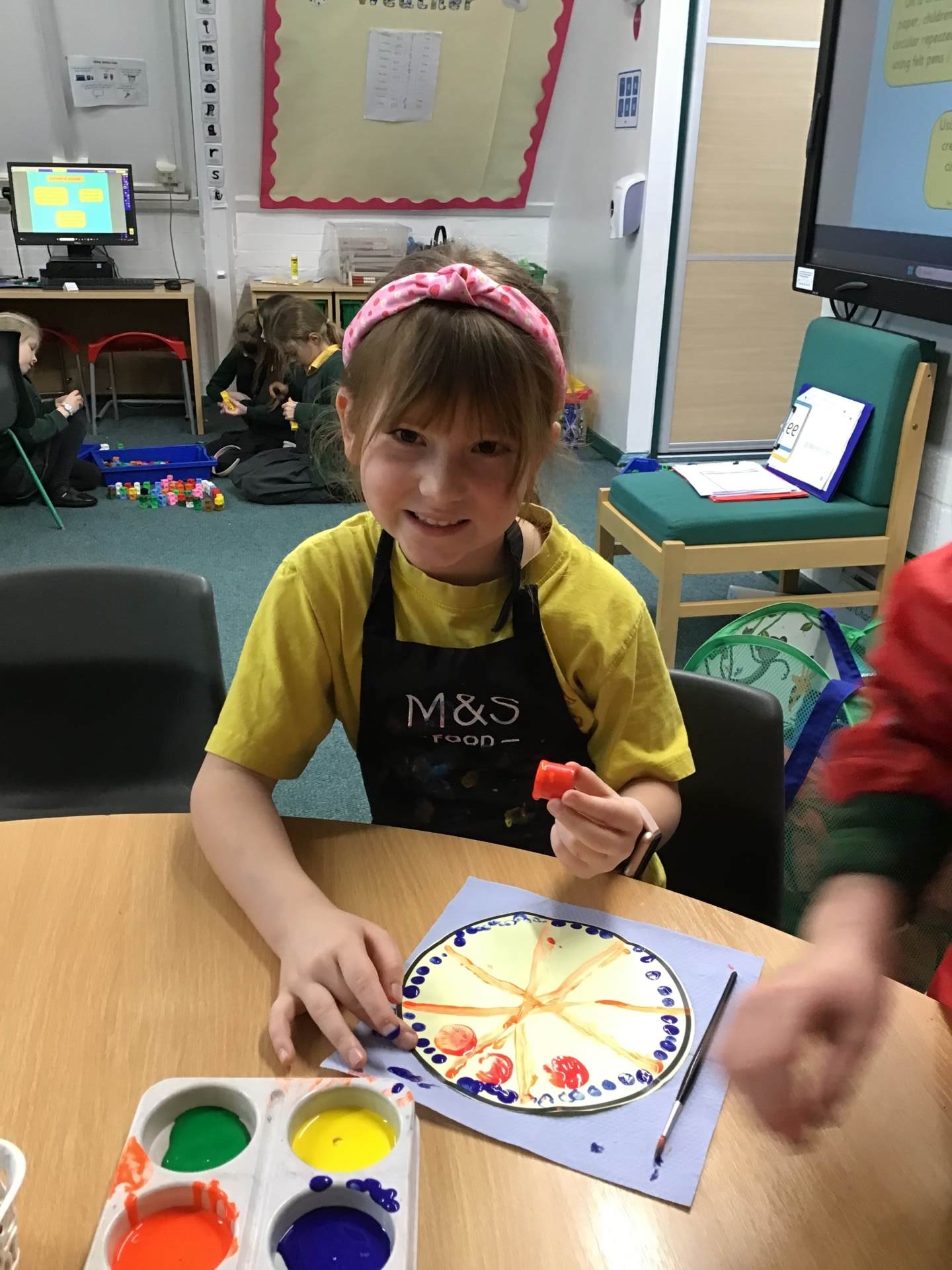 In Art this week we have been using paint and free moving objects to create patterns on circular paper.