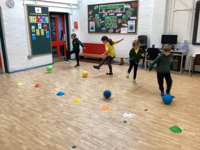 In PE we practiced our ball skills. We needed to maintain control of the ball at all times (which was tricky for some of us!) whilst moving the ball in different directions. Our movements needed to be smooth and fluent.