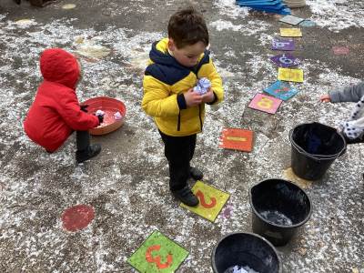 We enjoyed exploring the snowy playground on our first day back! We drew in the snow, scraped the snow, swept the snow and cooked with it in our mud kitchen! Some of us managed to catch a few falling flakes on our tongues too!