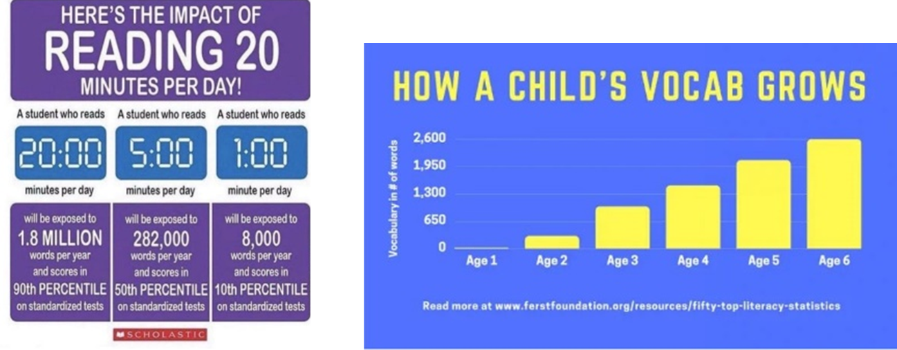 We know that children who read only one book a day hear approximately 290,000 more words by age 5 than those who don’t regularly read books with a parent or care giver (Logan, 2019). We know that children who read regularly for enjoyment everyday not only perform better in reading tests than those that don’t but also develop a broader vocabulary, increased general knowledge and a better understanding of other cultures. Therefore, it is our unquestionable duty to read to our children and expose them to the joys of story language while teaching them systematic, synthetic phonics so that children are fluent, independent readers by the age of 7.
