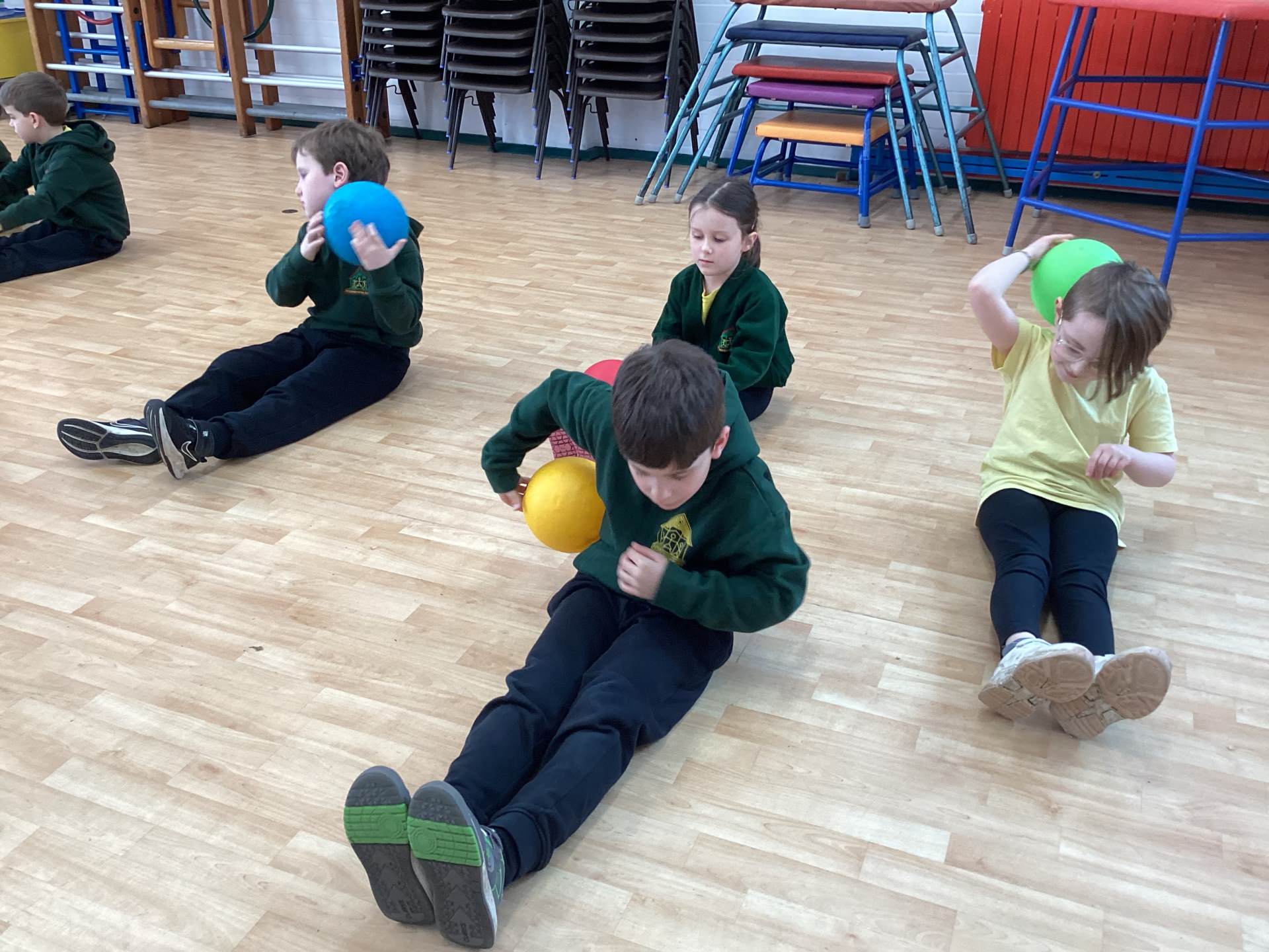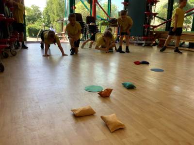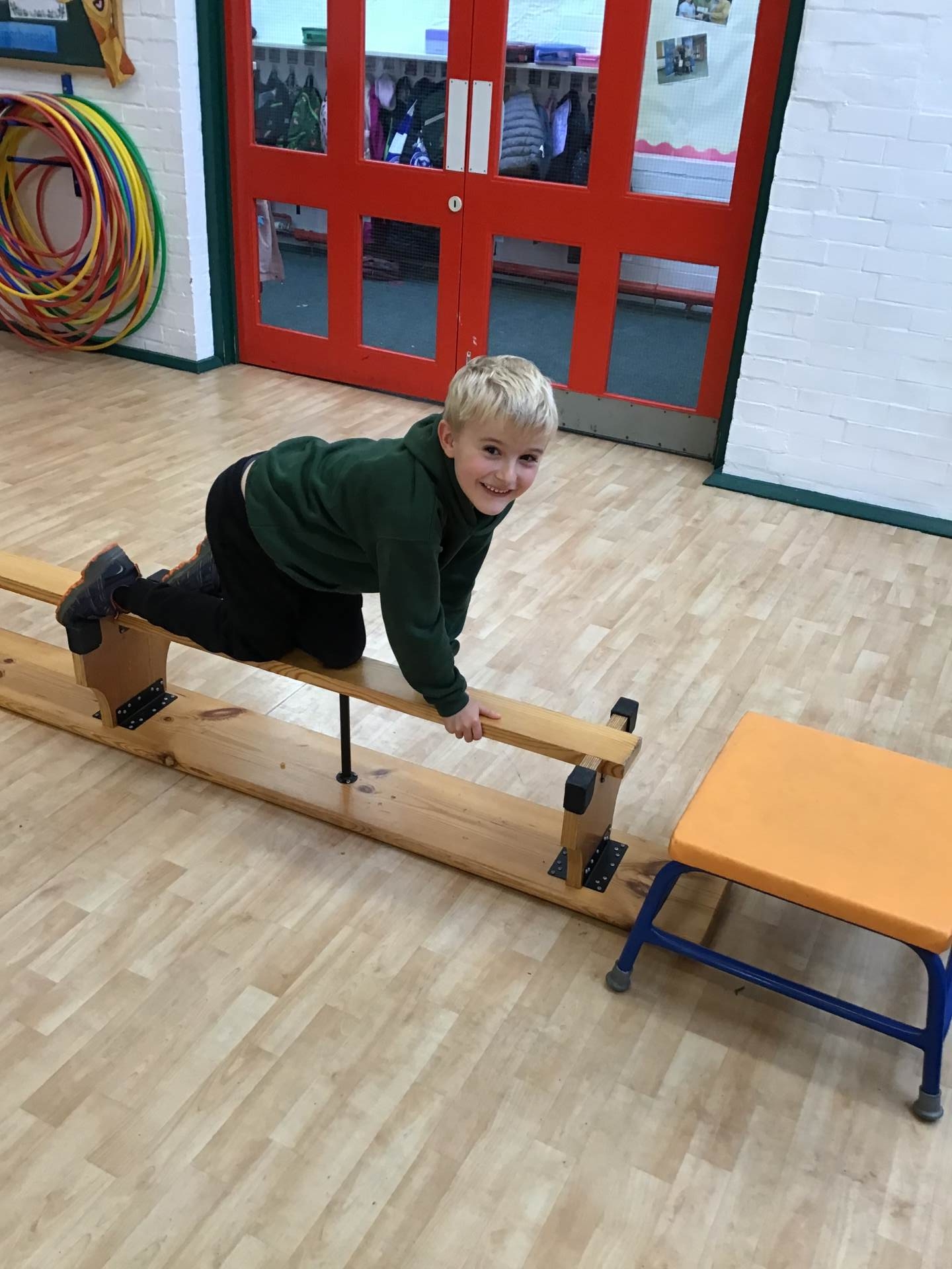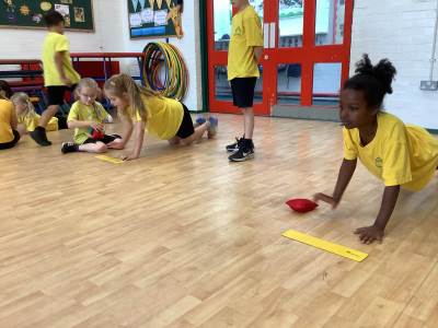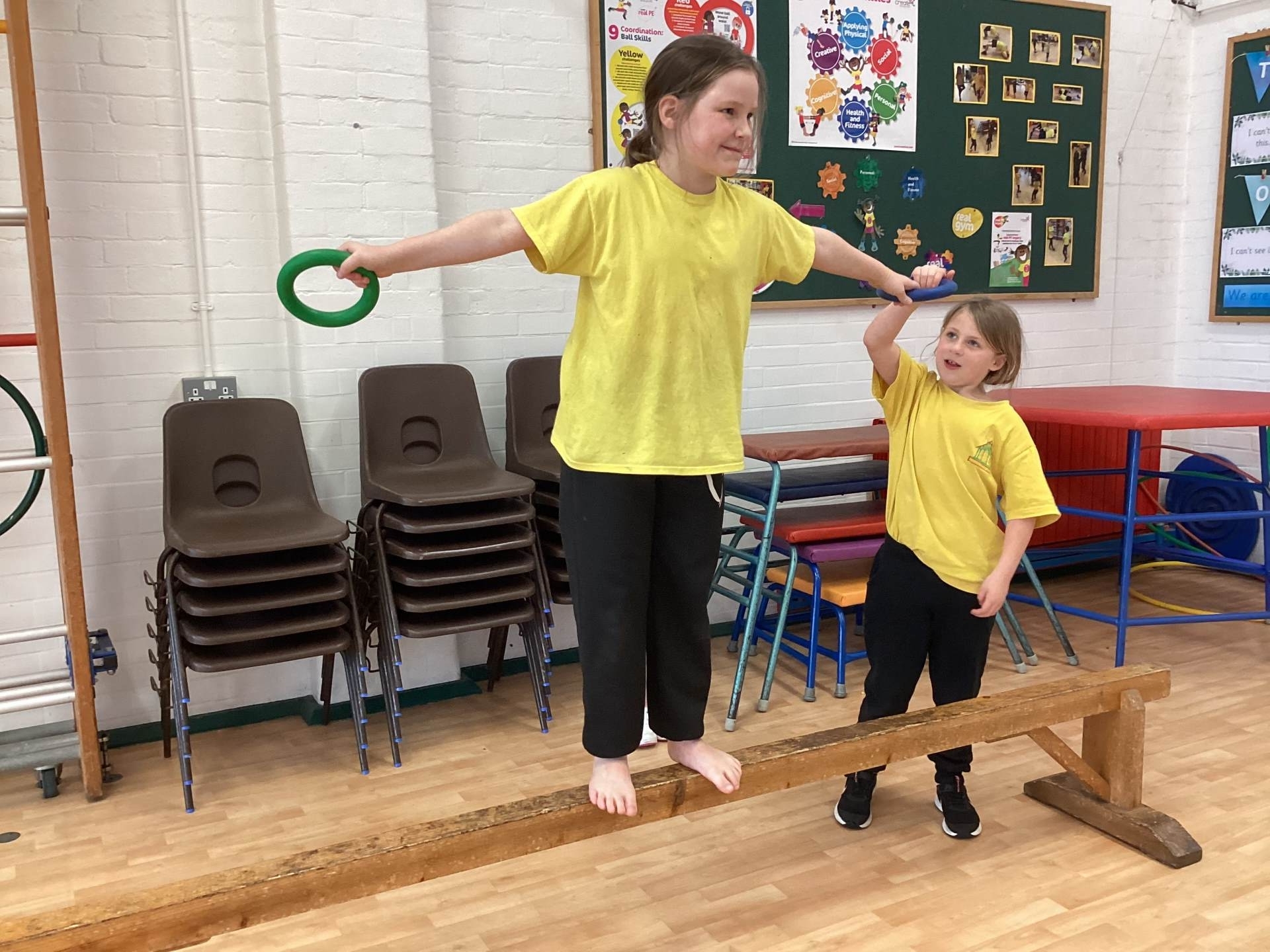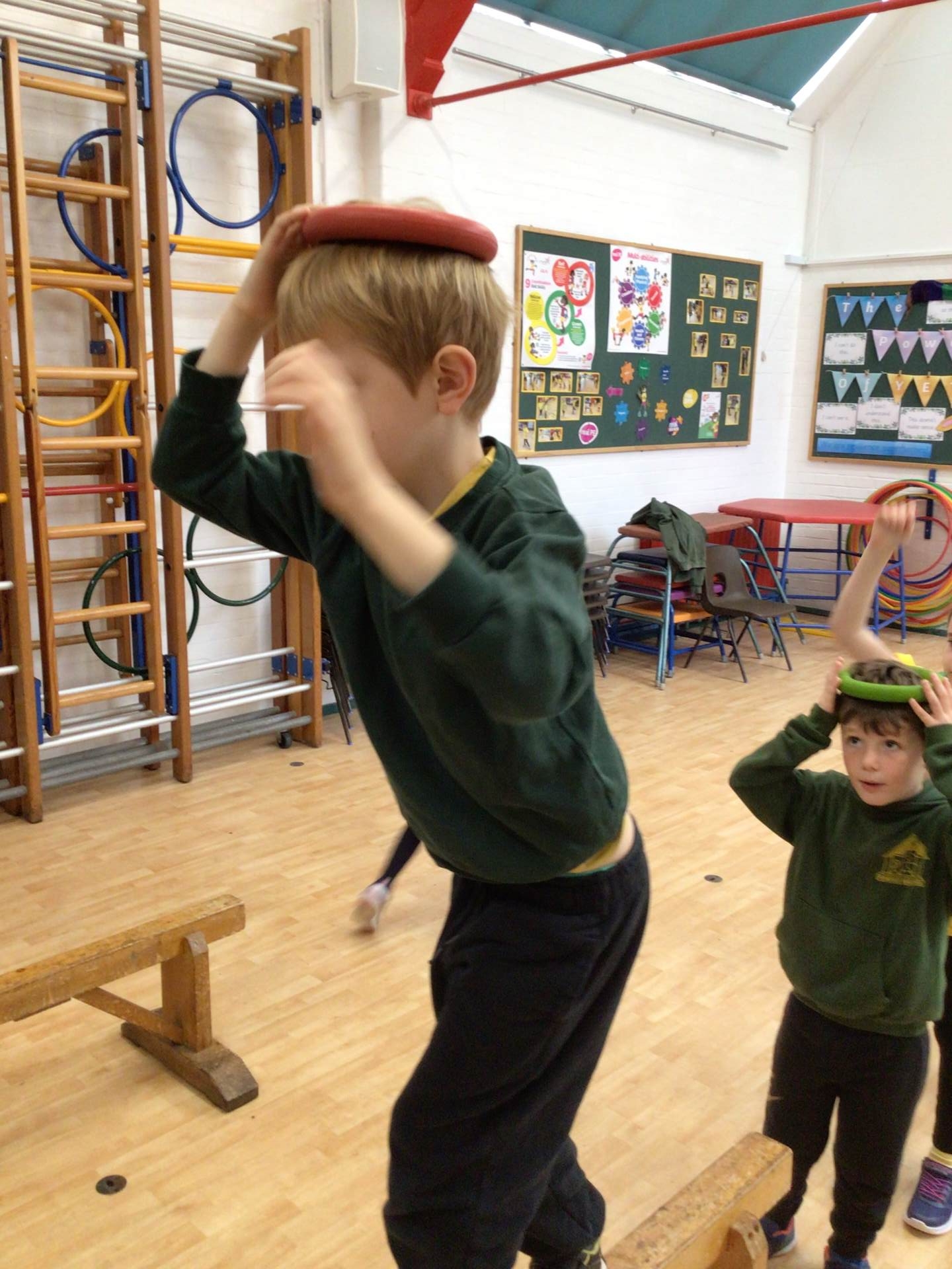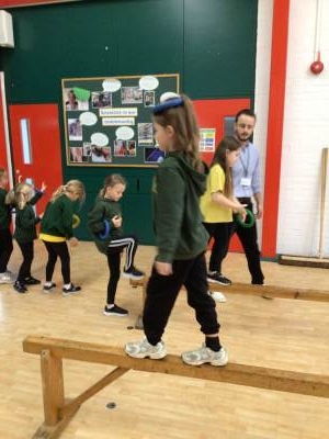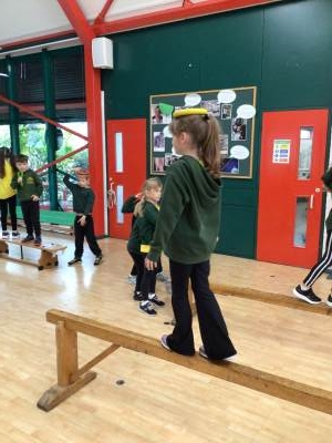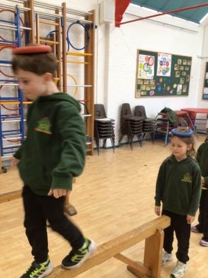 In P.E., we focused on balance and coordination. We challenged ourselves to walk across a beam while balancing a quoit on our heads – it was tricky but lots of fun! Everyone tried their best and showed great determination.