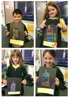 In RE we continued thinking about candlelight as a symbol. This week we considered how candles are used to remember something or someone. As it was Remembrance Day on Monday we talked about how we could use candles alongside the poppy symbol to remember those who have been brave through fighting in wars. We then drew our own candle using wax pastels and decided who or what we were remembering.