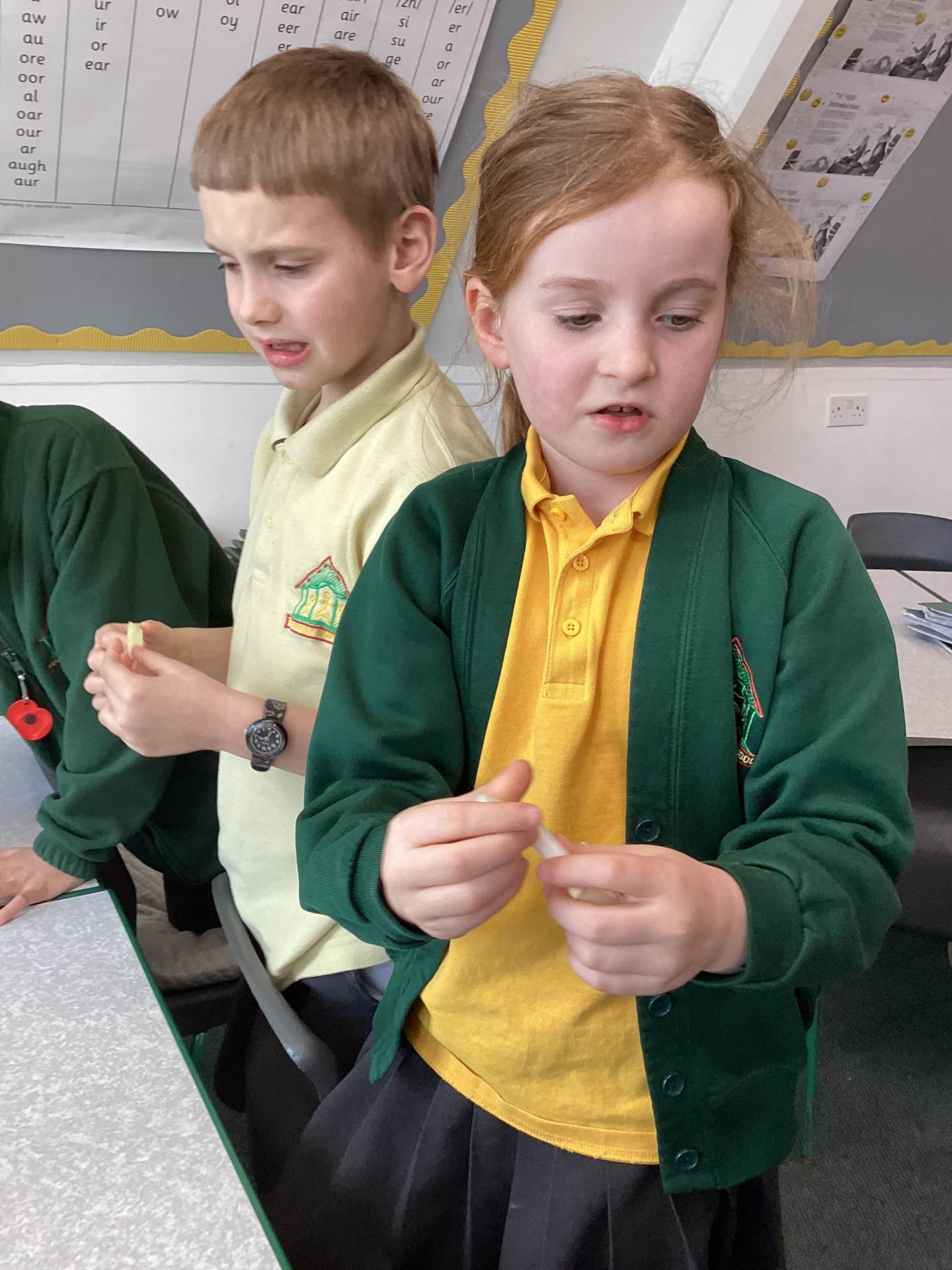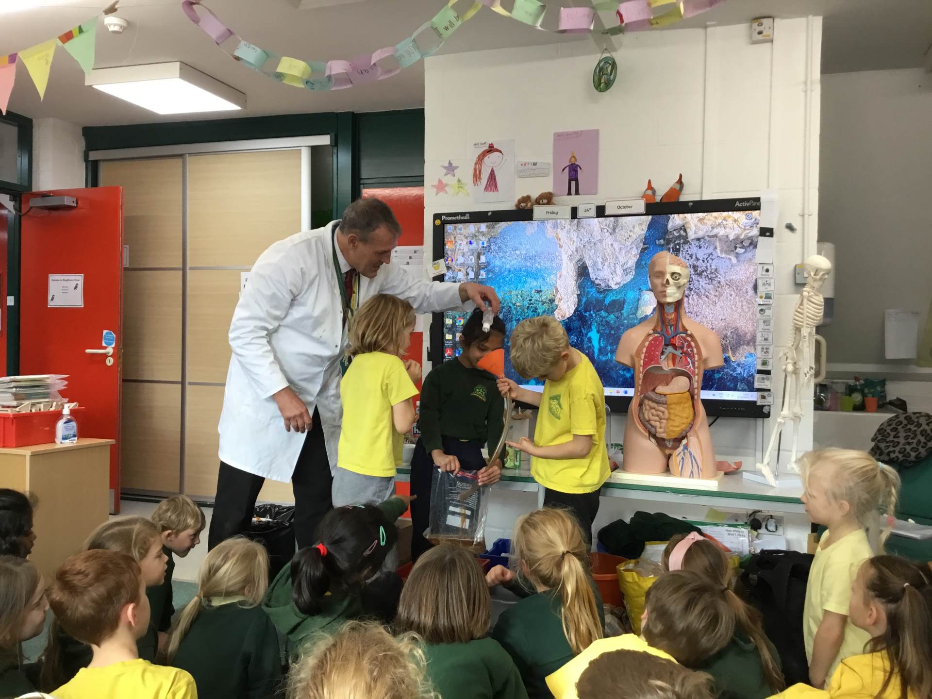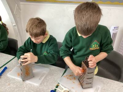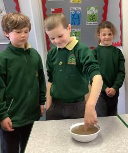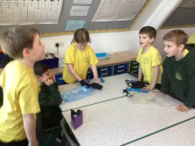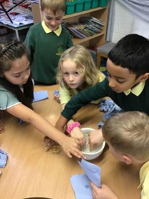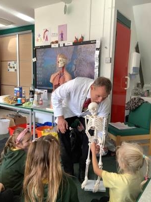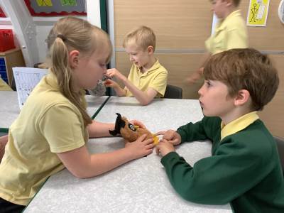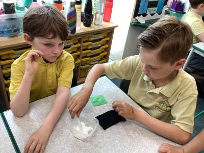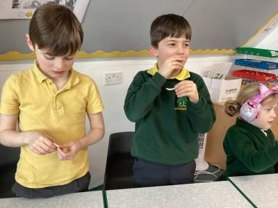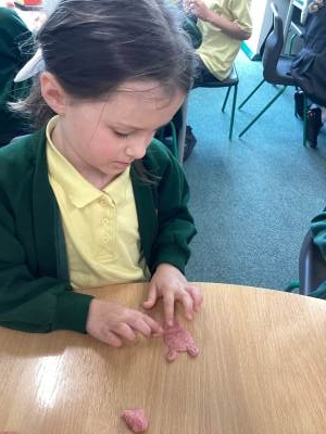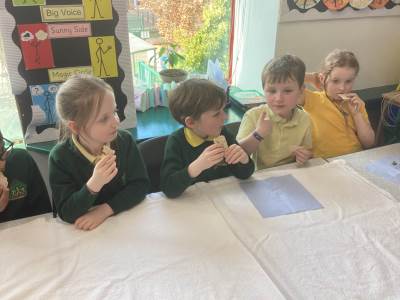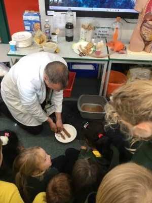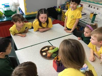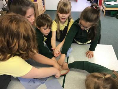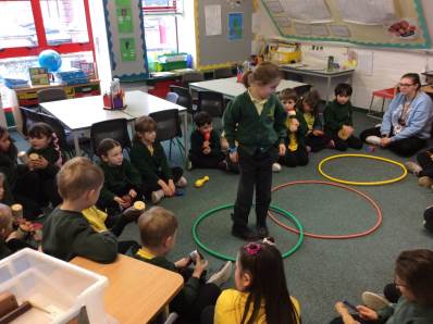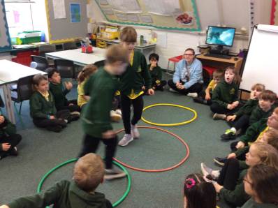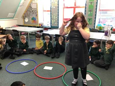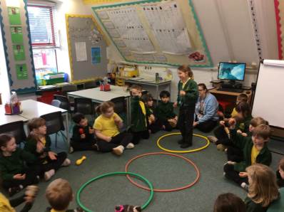 In Science we have been learning about how exercise, healthy eating and sleep are good for our bodies. We completed 5 different exercise activities such as running, jumping, skipping or hopping for 2 minutes. We found out about our pulse and we had to count our pulse rate very carefully to find out which exercise raised our heart rate the most. We then talked about The Eatwell Guide; to find out which foods belong to which group. Dr Geary then joined us for some Science Workshops on Friday. He showed us how our bodies digest food and we helped him demonstrate this using real food!