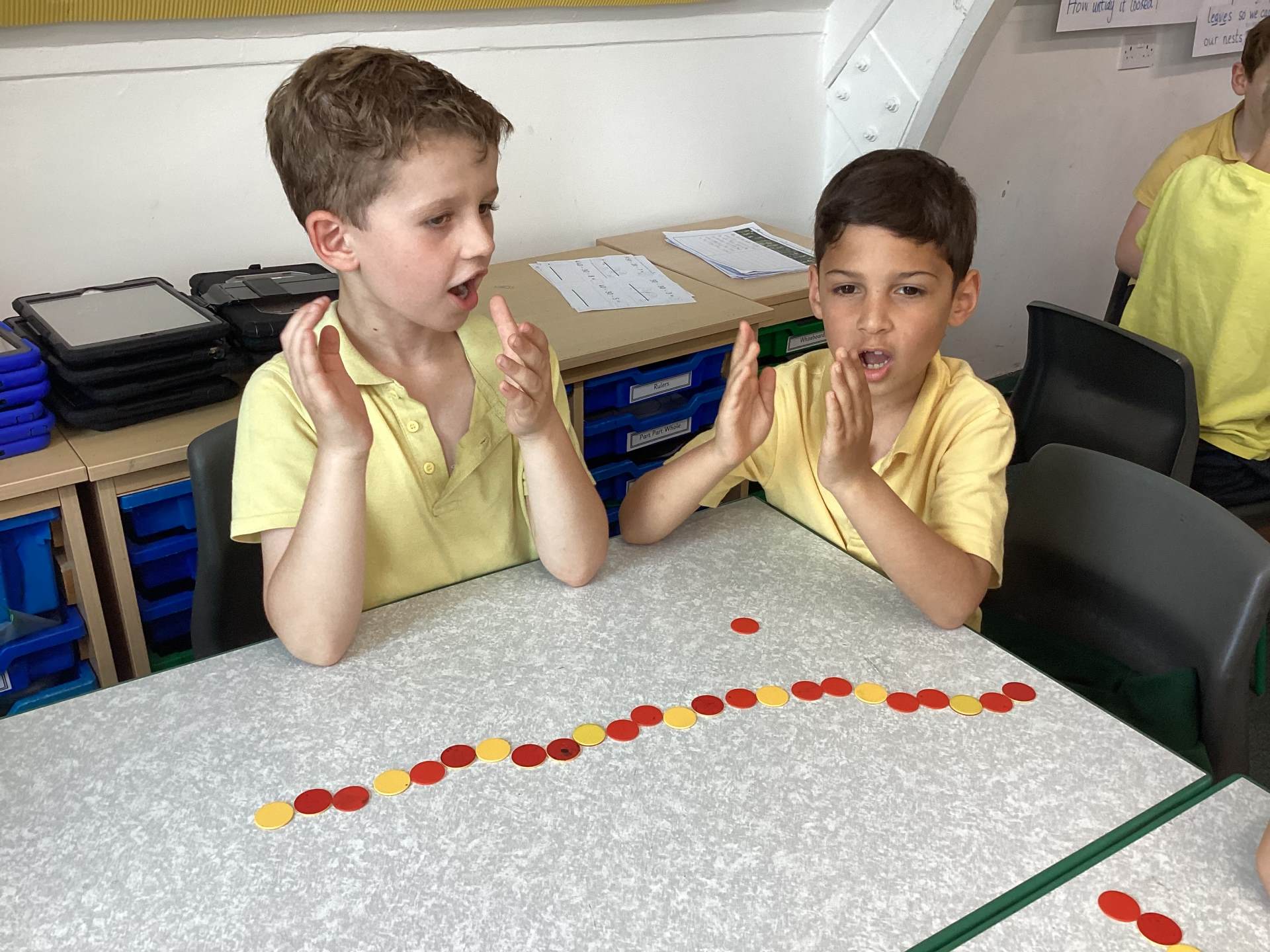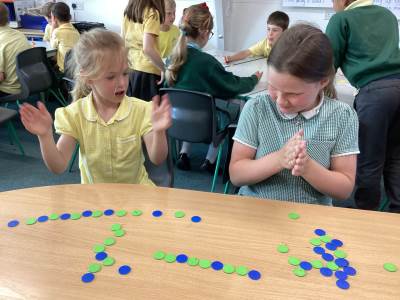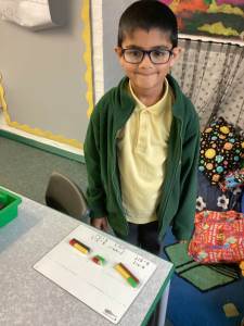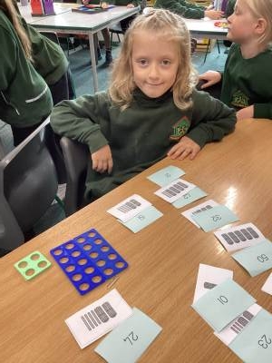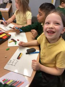 In Maths we have been learning to use our number facts to help us with addition and subtraction of a 1-digit number from a 2-digit number. We have also been using our Rekenreks during Mastering Number to make numbers up to 20 ensuring that we fill our top row first making it easier for us to subitise these numbers as opposed to counting them.