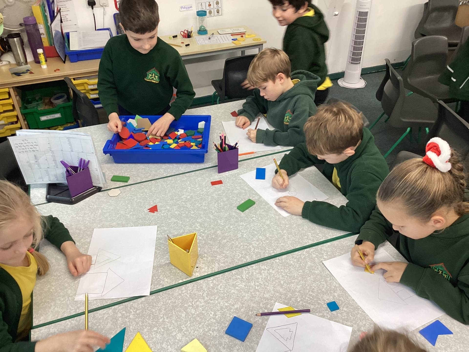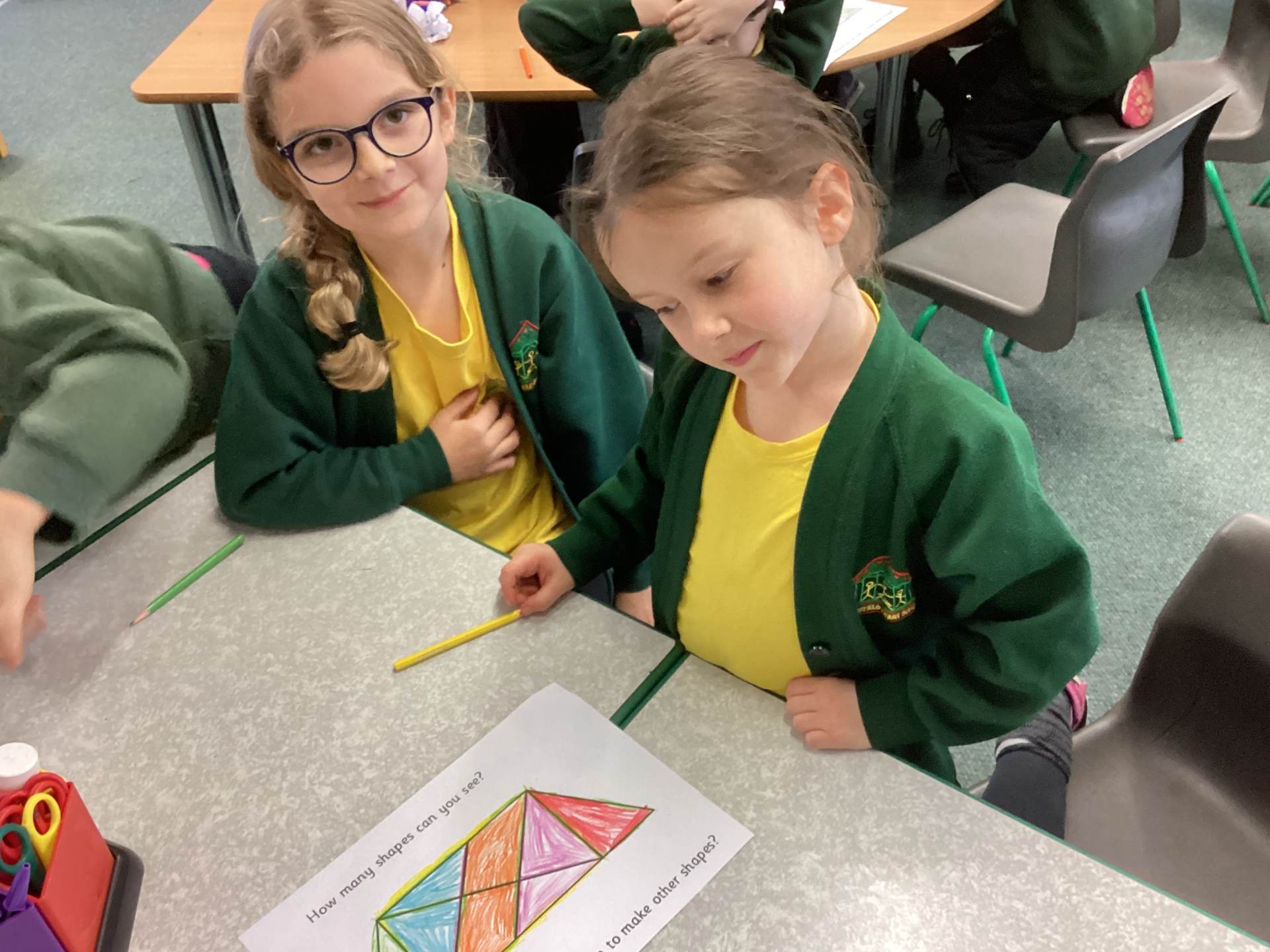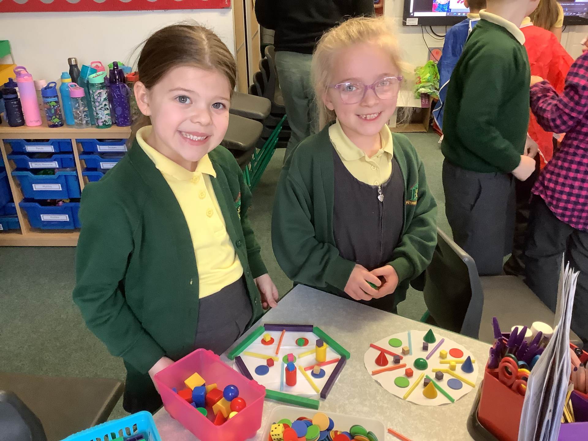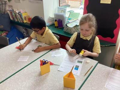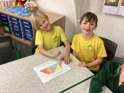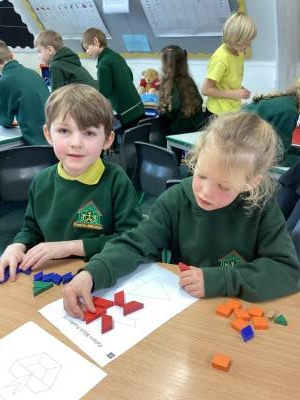 In maths we have been exploring lots of 2D and 3D shapes. We have learned to name them, count their sides, corners and faces, and notice the shapes hidden inside bigger shapes. The children especially enjoyed finding real-life examples in the classroom, such as cuboid cereal boxes and cylinder glue sticks, and talking about what makes each shape special.
