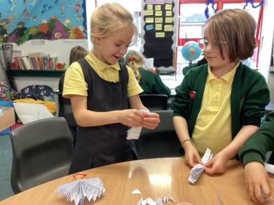 In Art some of us have had fun making 3D angels. We learnt a new skill of pleating paper which some of us found very difficult. However, we showed resilience by sticking at it. We were also helped by our kind friends who offered words of support and encouragement, as well as a helpful hand!