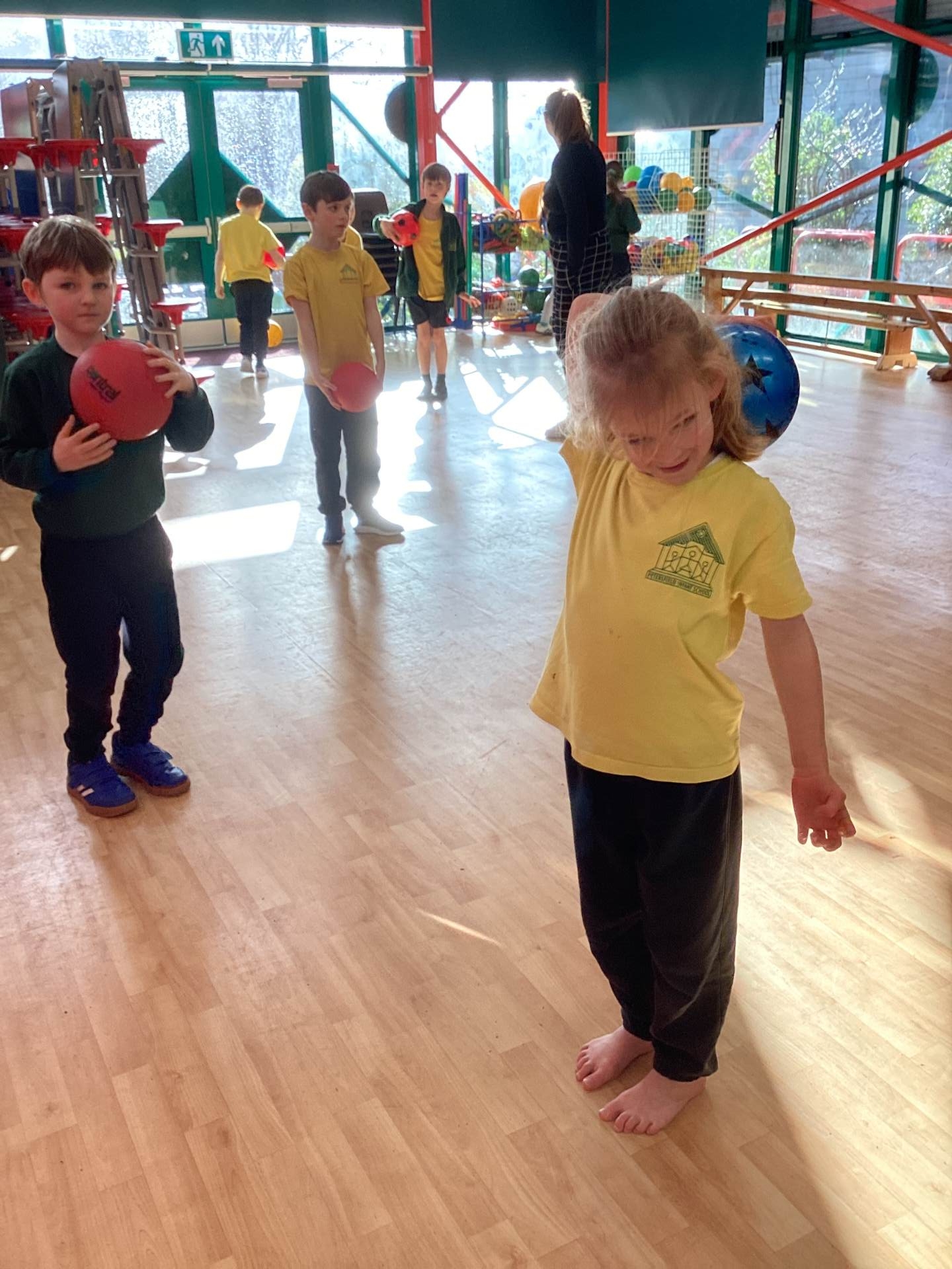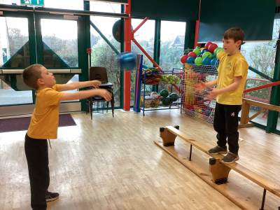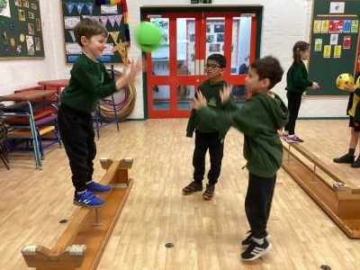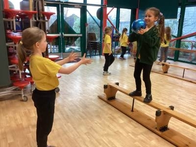 In PE, we practised our balancing skills. This time, we worked in pairs and challenged each other to stay balanced while standing on a beam and catching and throwing a ball! What fun this was!