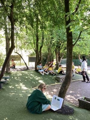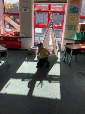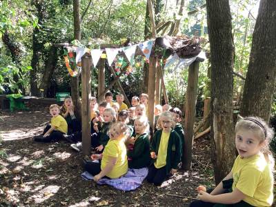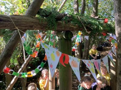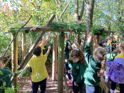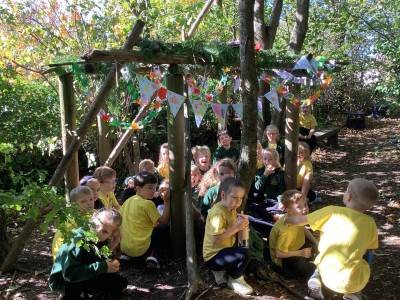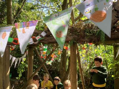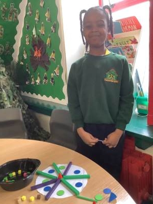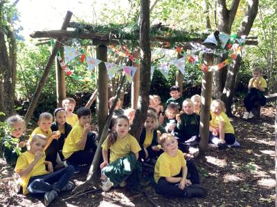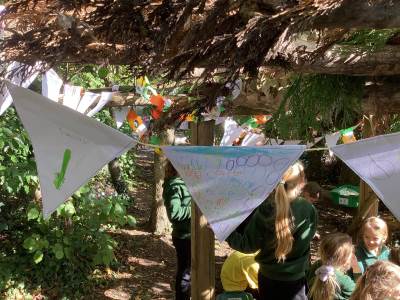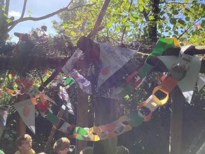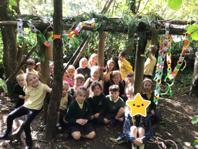 This week we were very excited as we used the forest for our learning. We built a Sukkah out of large branches and made the roof out of leaves. We then decorated it with colourful bunting and paperchains that we had made in class. When it was finished, we sat under it and ate an apple. This allowed us to deepen our understanding of how Jews celebrate the Festival of Sukkot. They build a shelter in their gardens, which represents the shelters their ancestors built in the desert. They eat their meals in them and some even sleep in them for 7 days. It was a lot of fun!