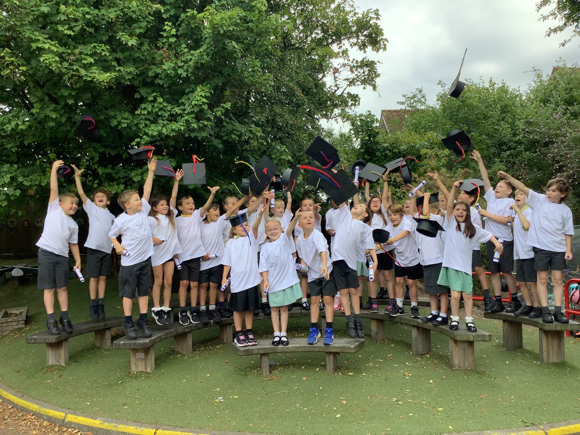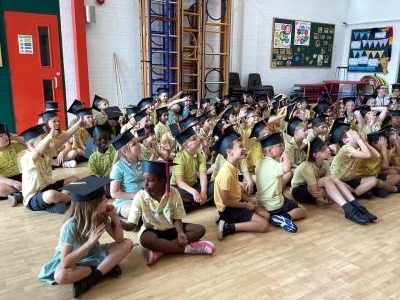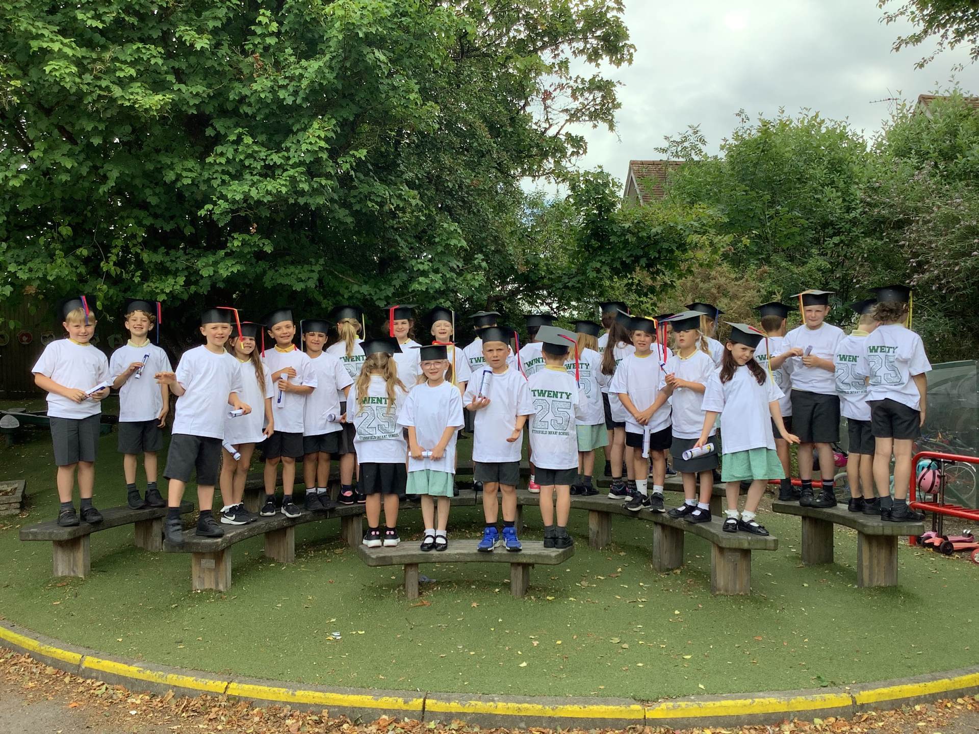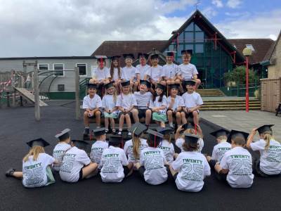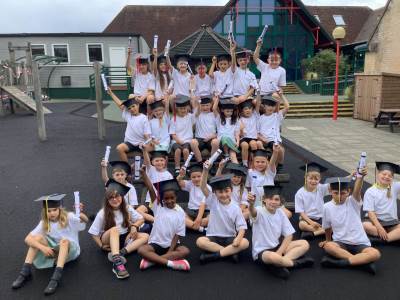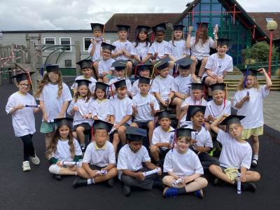 This week the Year 2 children were treated to a graduation ceremony, where they donned their mortar boards and were presented with a special t-shirt and scroll. The Year 1's kindly made flags to wave as we walked on to the playground to the awaiting, cheering crowd of our families. It was wonderful!