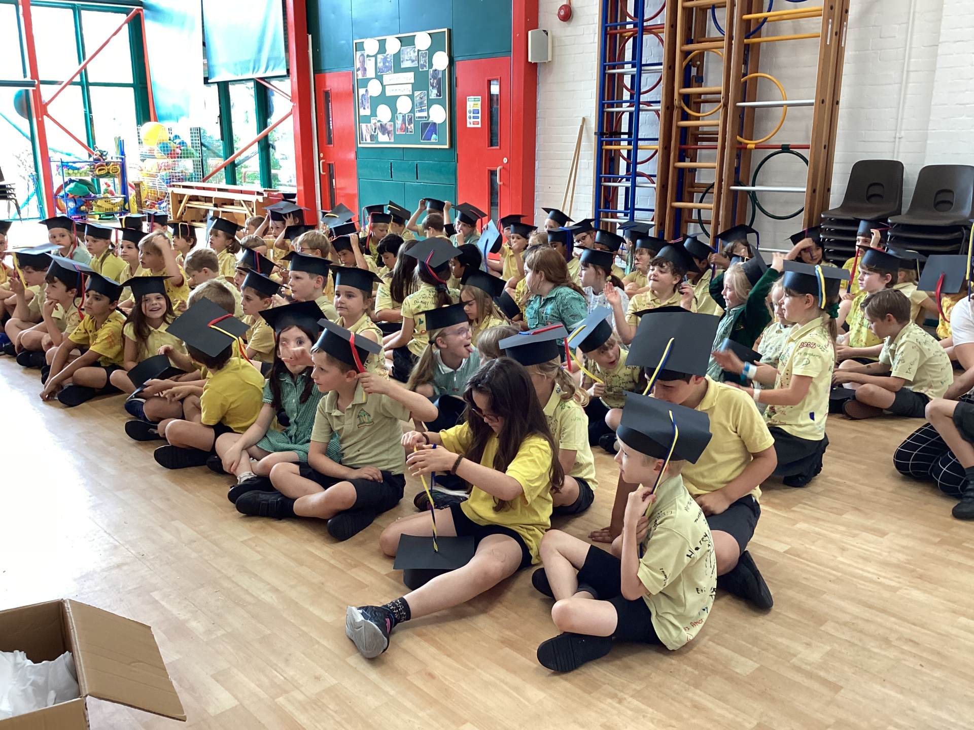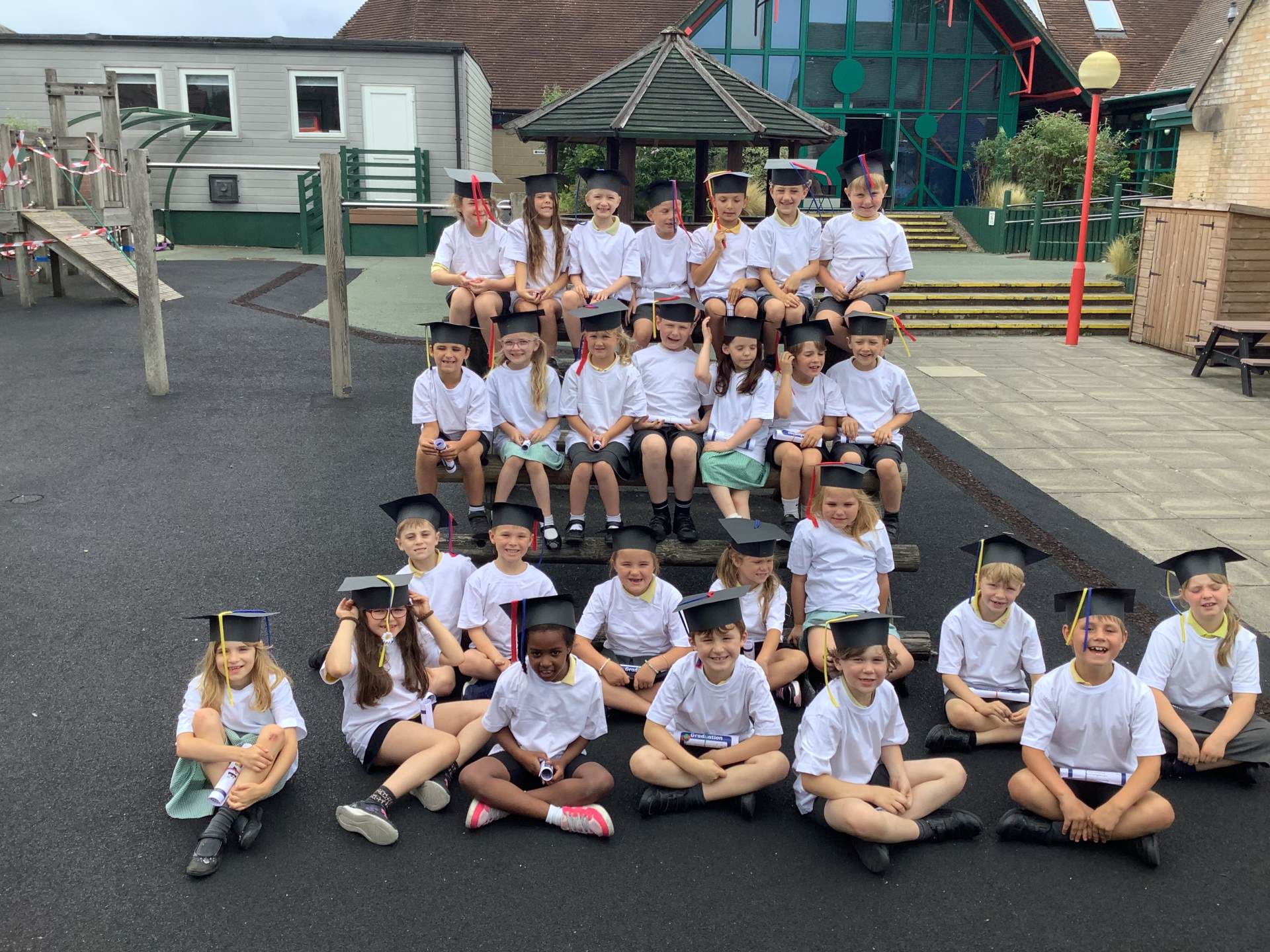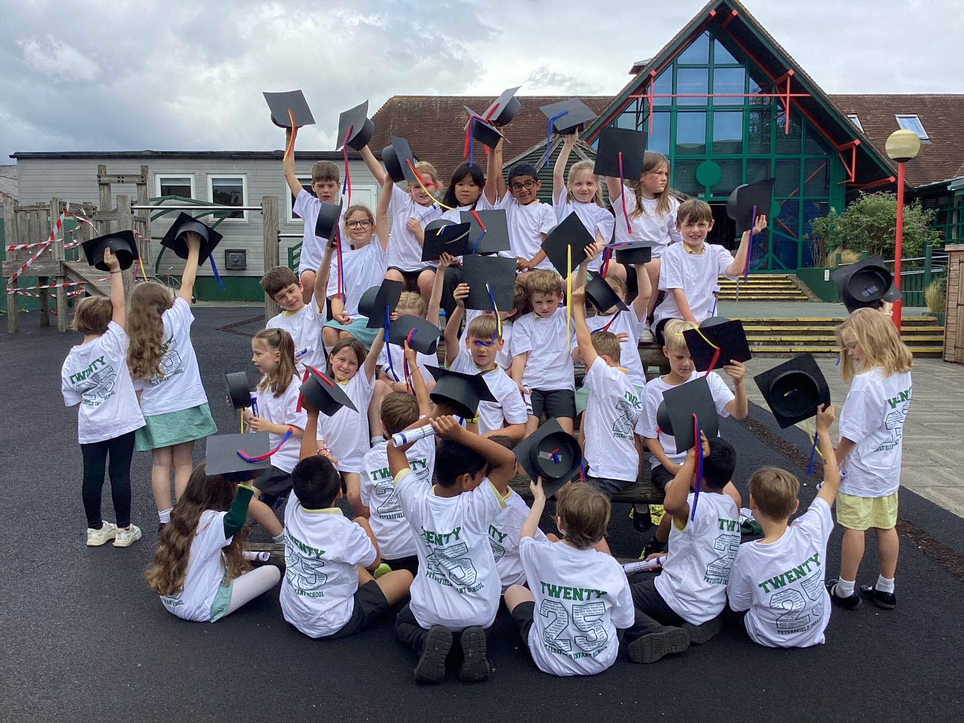This week the Year 2 children were treated to a graduation ceremony, where they donned their mortar boards and were presented with a special t-shirt and scroll. The Year 1's kindly made flags to wave as we walked on to the playground to the awaiting, cheering crowd of our families. It was wonderful!