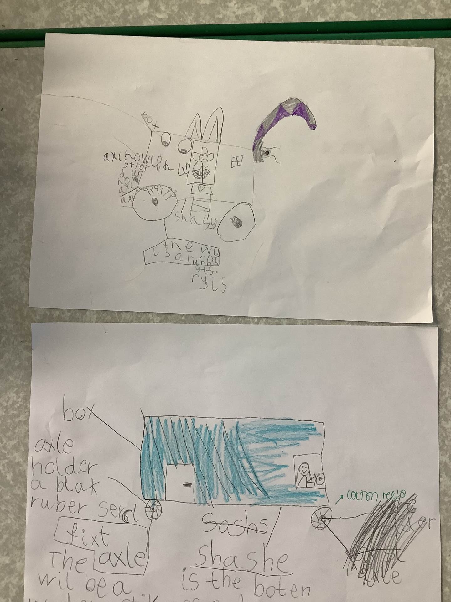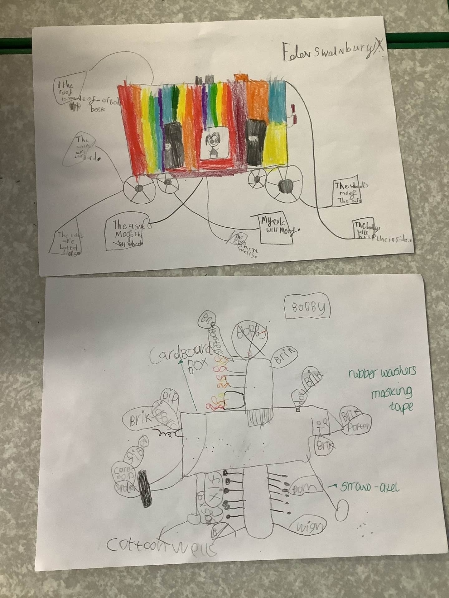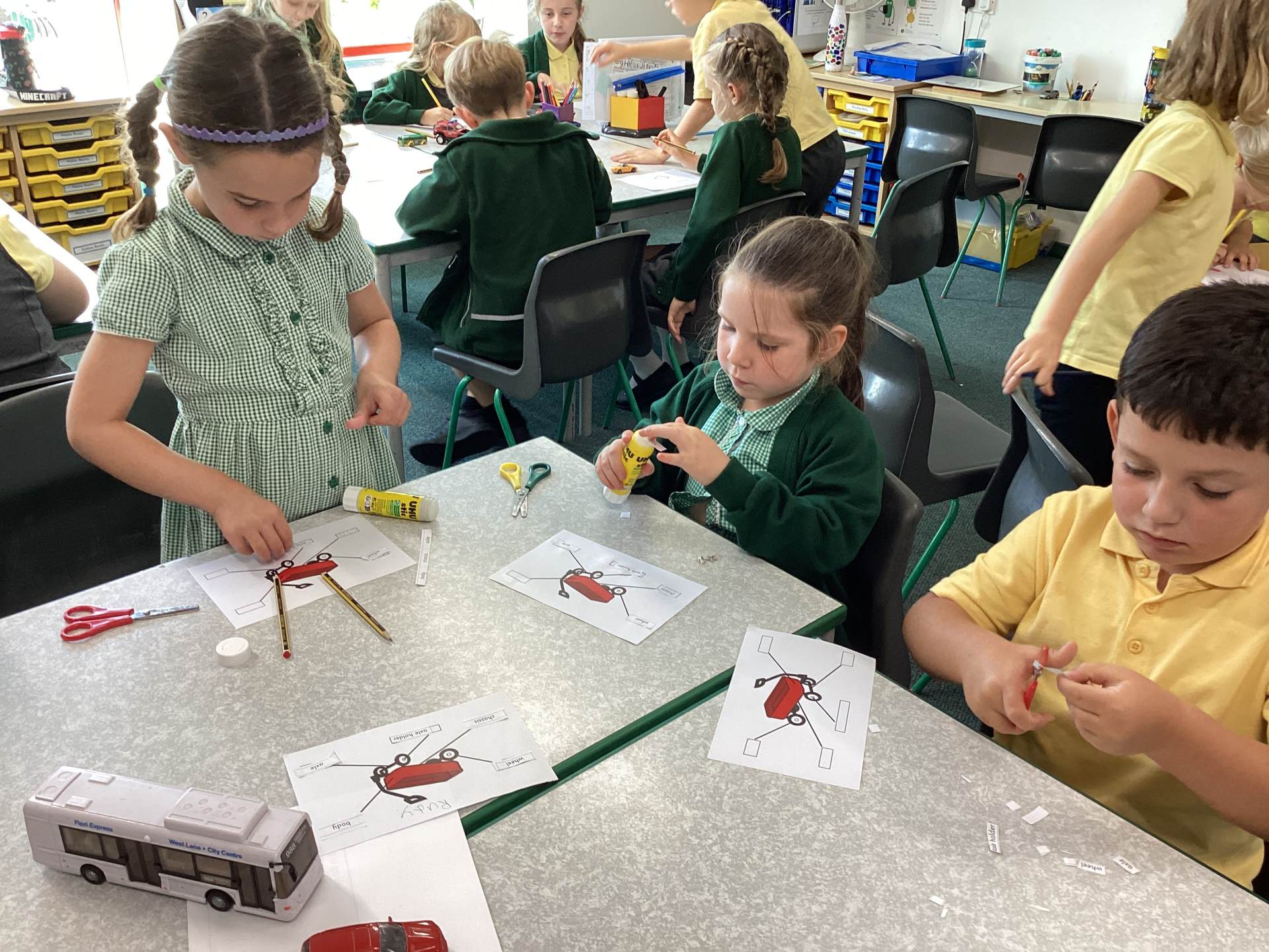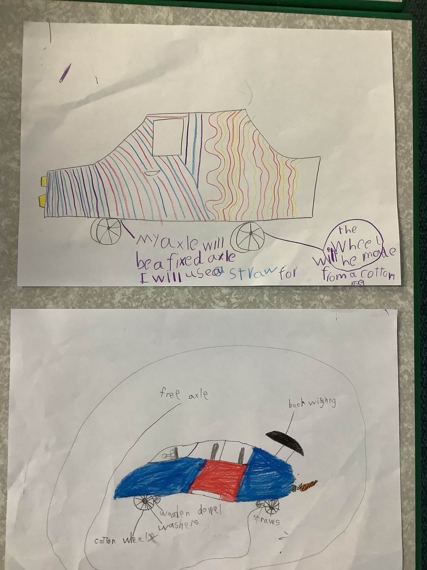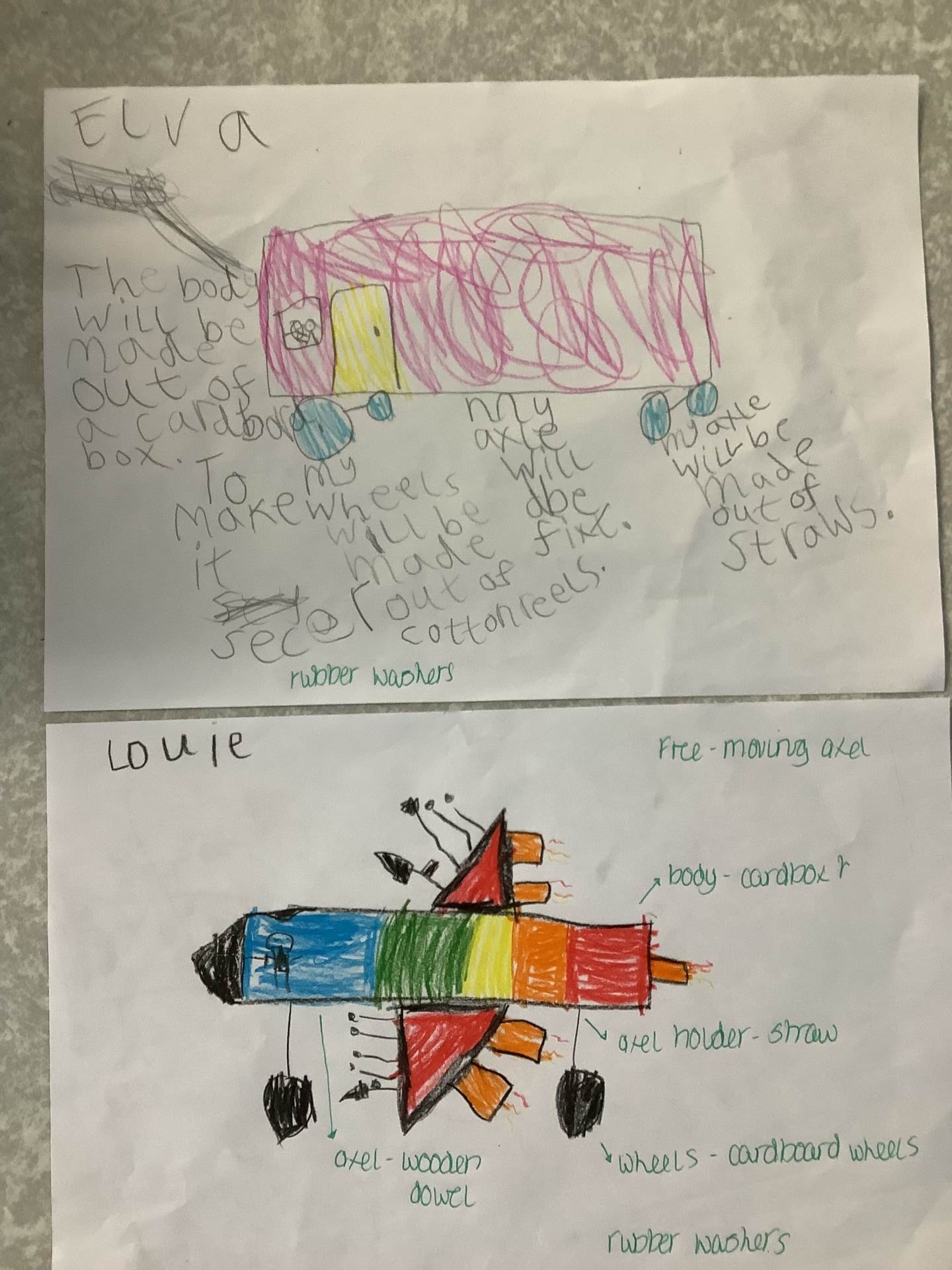In DT we practised using wheels and axles. We used Lego, Mobilo and Knex to make vehicles that could move. We learned about fixed axles, where the wheels move on their own, and free axles, where the wheels and axle turn together. We tried out different axle holders and tested our models to see which worked the best.