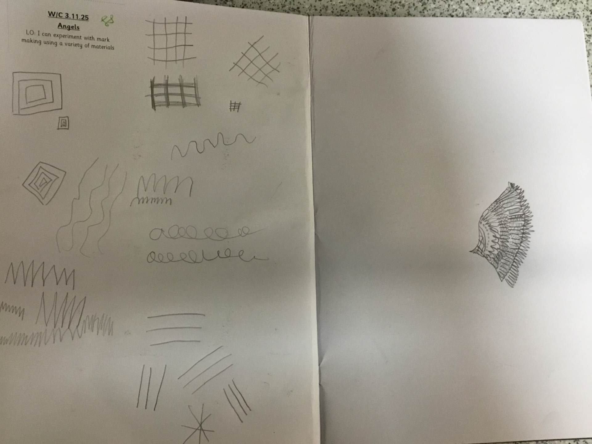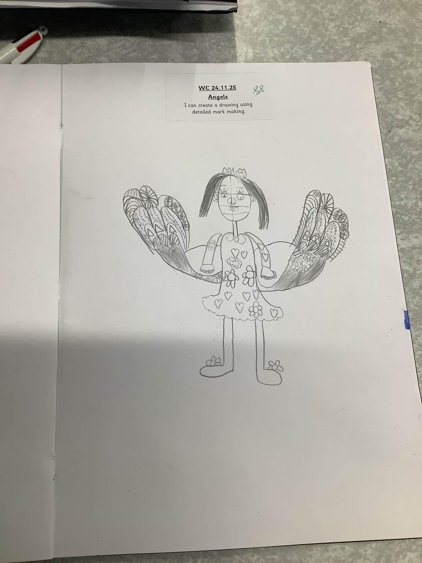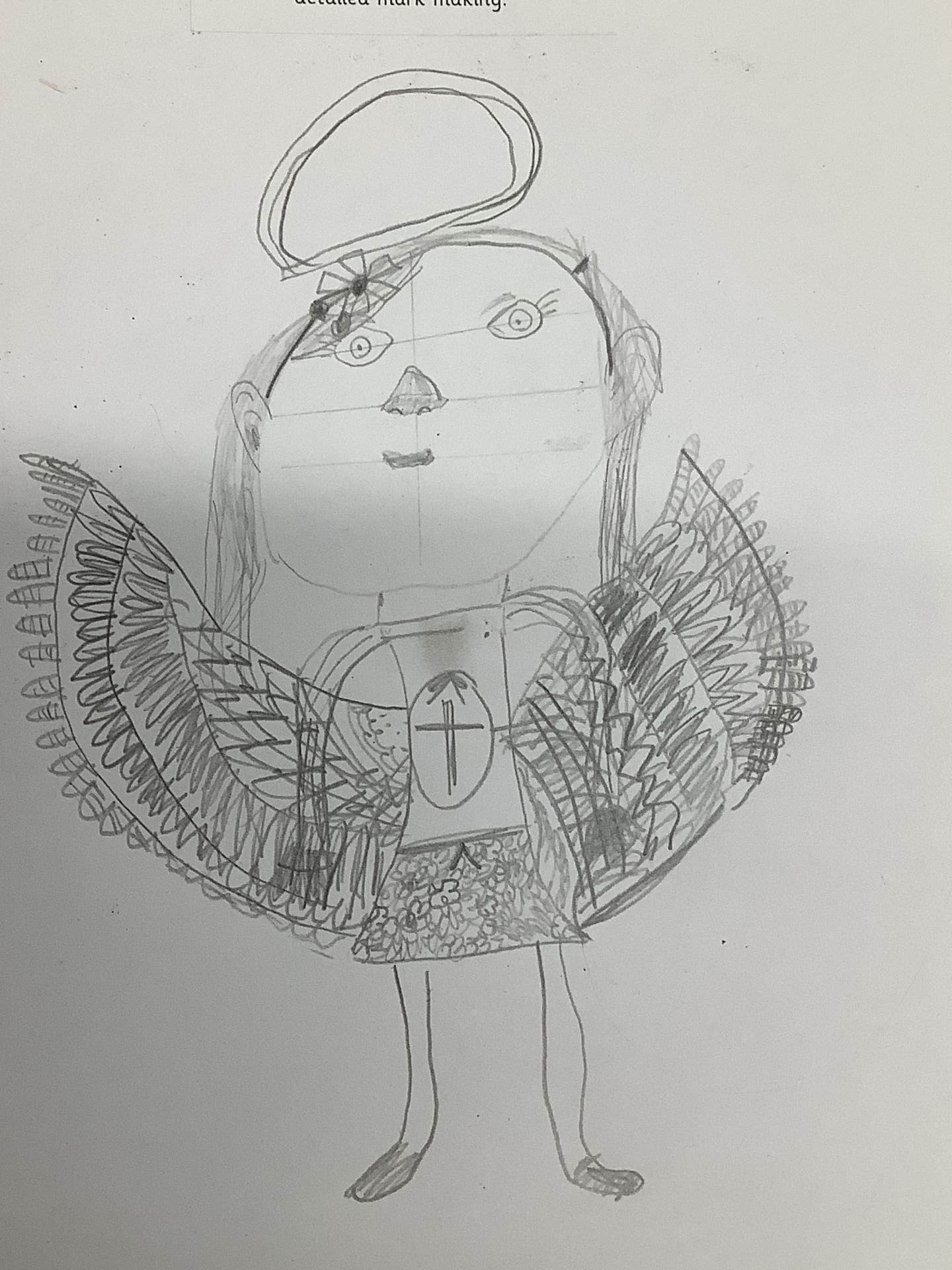 In Art, we moved on from self-portraits to drawing a picture of an Angel in our own image. We used the mark marking skills we had practised to help us draw the wings and then the body and the face resembled us.