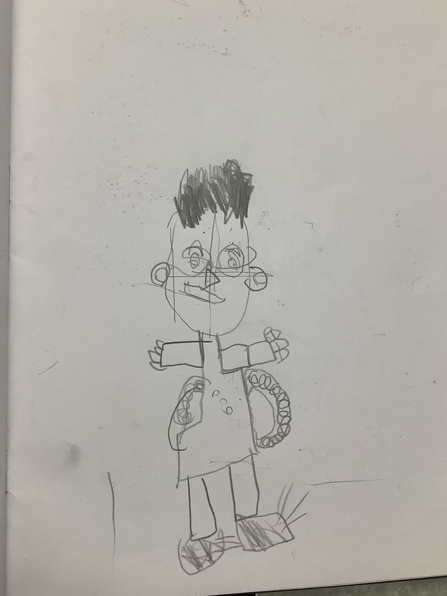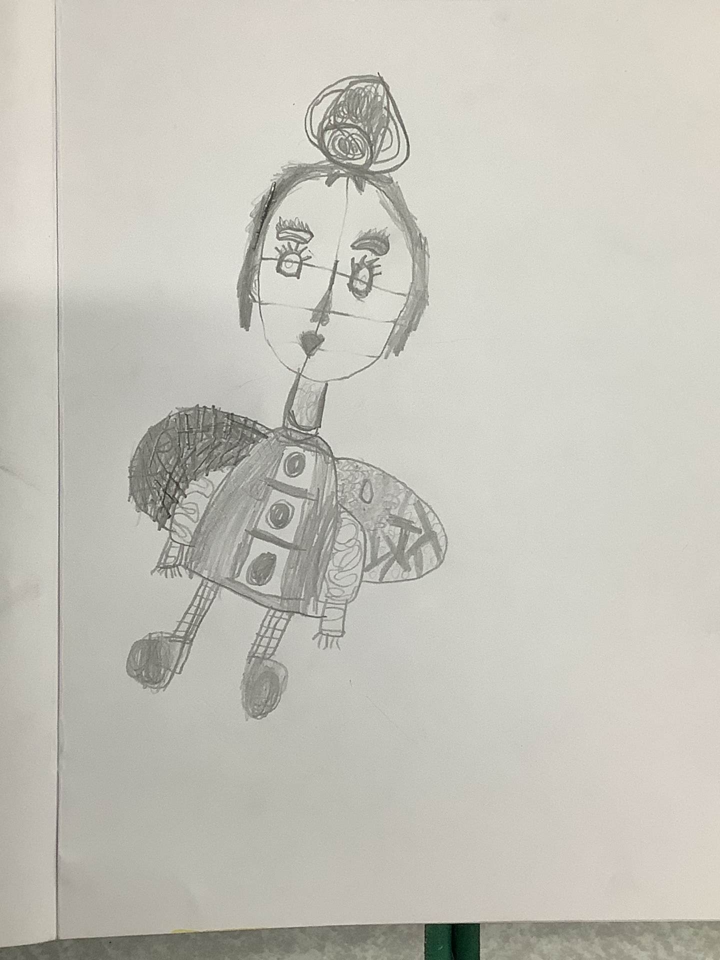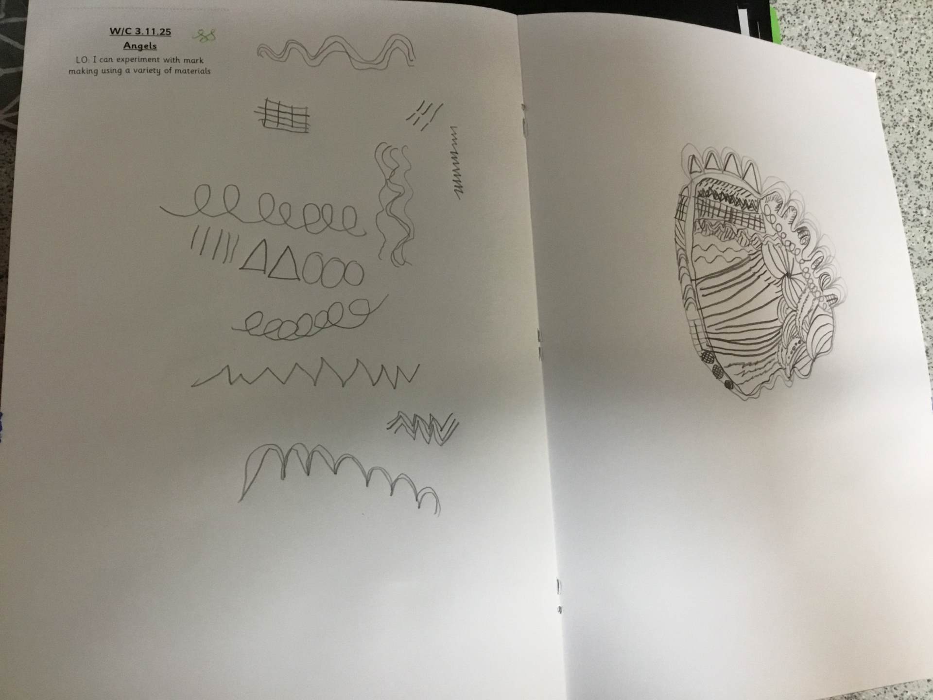 In Art, we moved on from self-portraits to drawing a picture of an Angel in our own image. We used the mark marking skills we had practised to help us draw the wings and then the body and the face resembled us.