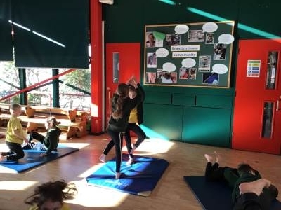 In P.E. we thought about balance and co-ordination. We practised difference balances on the mats and mirrored what our partner was doing.