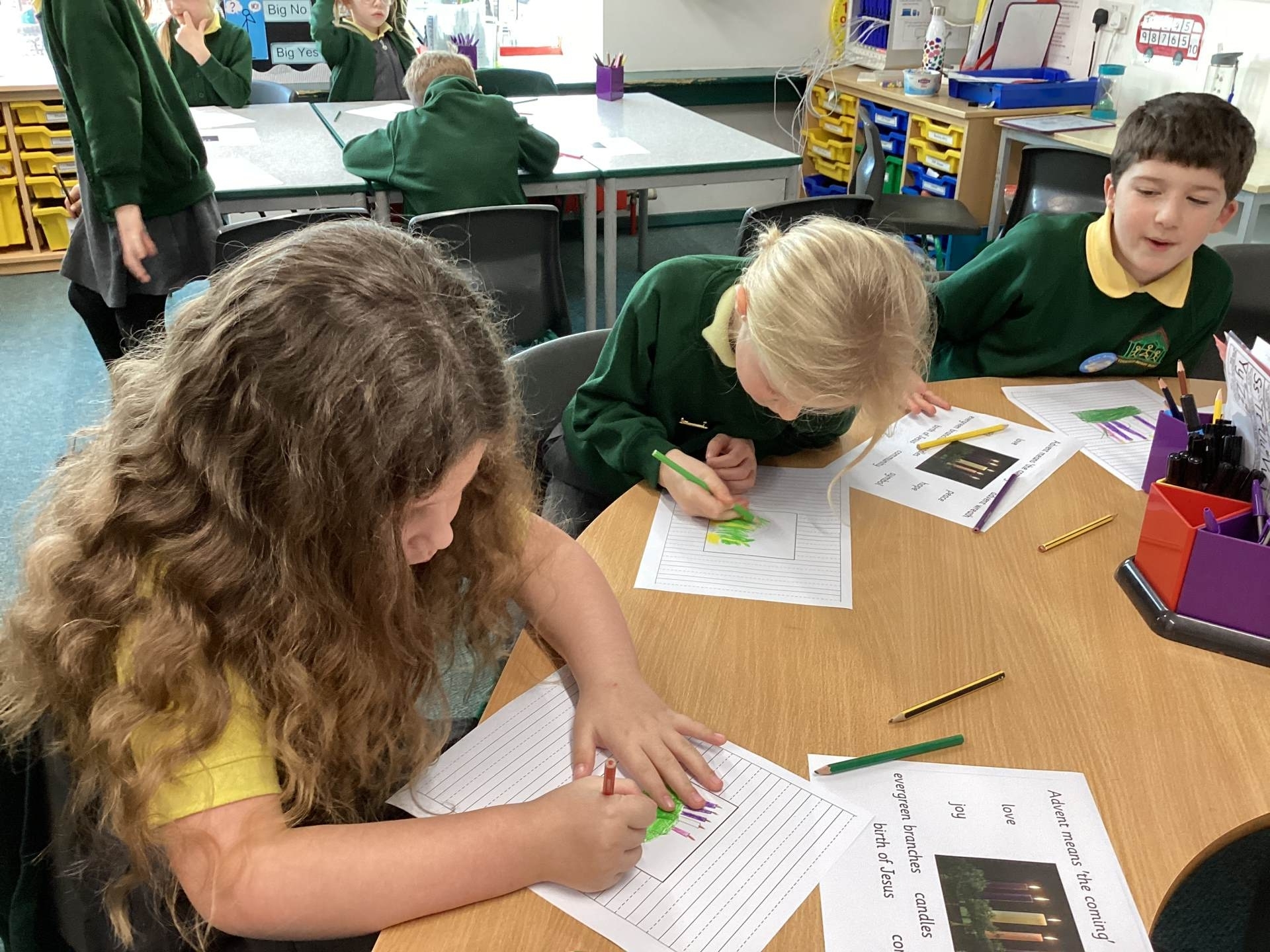 In RE we have been learning about Advent, which means ‘coming’ and is a Christian celebration to prepare for the Christmas of Jesus’ birth. Whilst some of us have an Advent calendar to countdown to Christmas, the church has its own rituals using candles. we looked at an Advent wreath and discussed what each part of it means. The round garland is a symbol for God. It has 5 candles on it- one for each of the four Sundays leading up to Christmas and one for Christmas Day itself. There are three purple candles on an Advent Wreath, which represent hope, peace and love. One pink which represents joy and a white one for Christmas Day which symbolises Jesus being the Light of the World.
