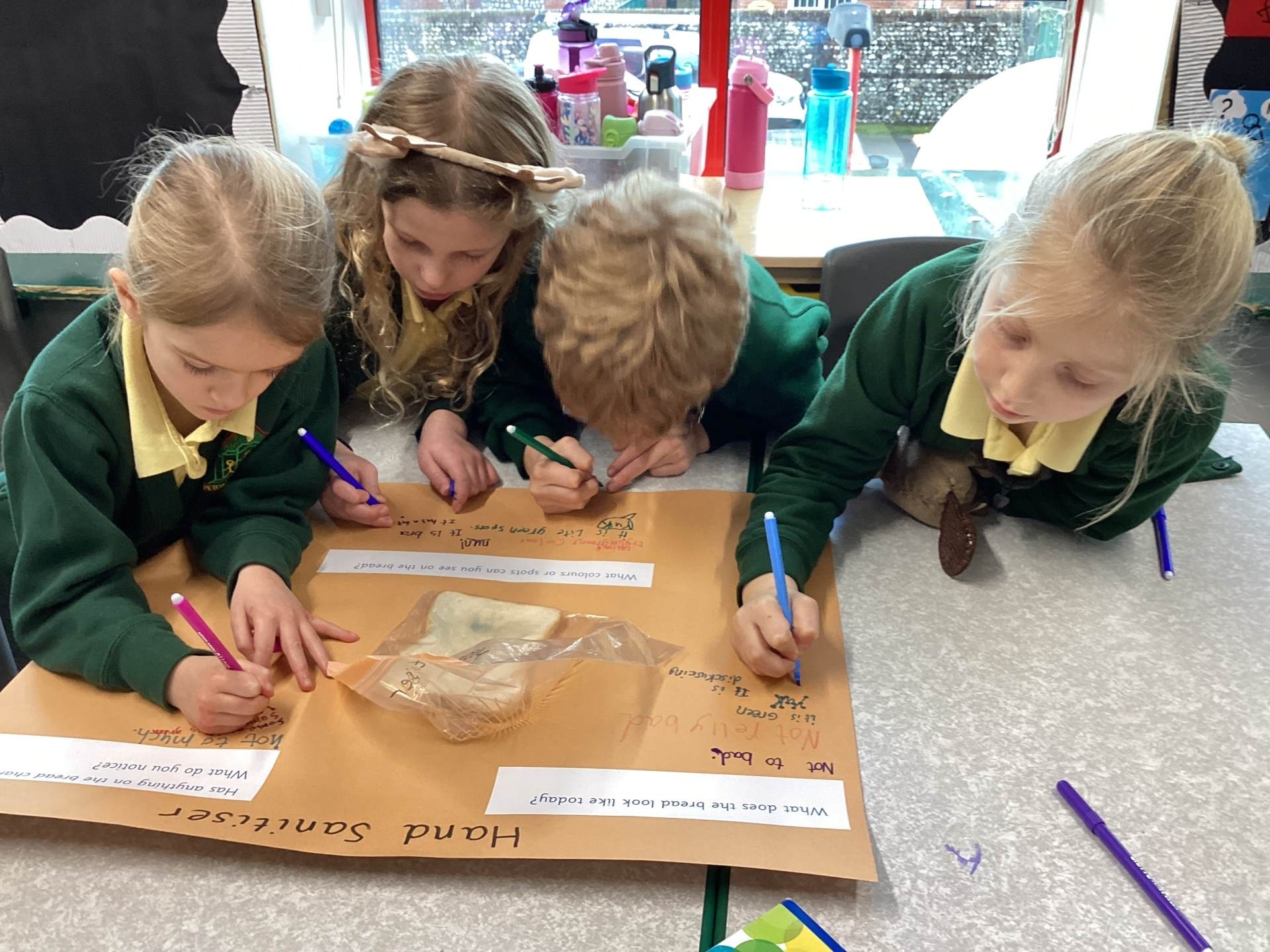 Our Science work focused on hygiene. We set up an experiment using slices of bread to find out how bacteria spread and how handwashing helps prevent it. Some of us washed our hands with soap and warm water, others used hand sanitiser, and some didn’t wash at all! We also rubbed a slice of bread on our classroom tables. Now we’re waiting to see which one grows the most bacteria. Our predictions are that the tables will have the most bacteria and that hand washing will destroy more bacteria than hand sanitiser! What’s your prediction?